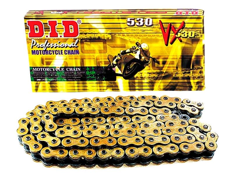 Cadena Did 530 VX X-Ring 116 ZB Oro. La cadena D.I.D VX X-Ring posee una resistencia al desgaste excepcional. El sistema de sellado X-Ring con cuatro puntos de contacto (Aros en X) y patentados por D.I.D, incrementan enormemente la capacidad de sellado, impiden la entrada de suciedad y la salida del lubricante es mucho mayor que en cualquier otra cadena de moto. Además, las cadenas con X-Ring tienen mayor resistencia al desgaste que el resto de cadenas. La construcción de las cadenas D.I.D con sistema X-Ring garantizan una reducción de la fricción ya que su acción de giro distribuye la presión y minimiza la pérdida de potencia. El cierre se realiza mediante remache.
