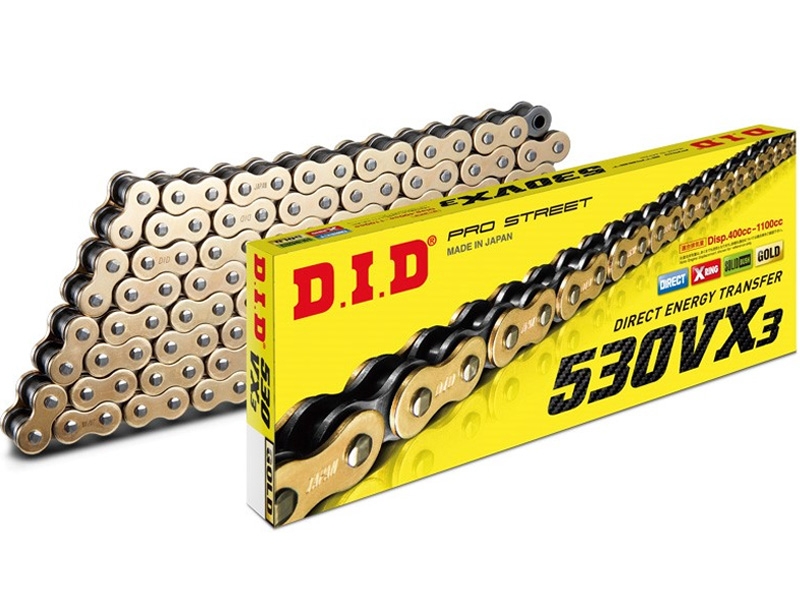 Cadena Did 530VX3 ZB 106 eslabones oro. Nueva cadena DID 530VX3 con retenes y juntas tóricas de anillo X de baja fricción. La nueva cadena DID 530VX3 cubre una gama más amplia de motocicletas (max 1100cc) y ofrece una vida más larga que el modelo anterior. También ha mejorado la transferencia de potencia a la rueda trasera y la rigidez general de la cadena para ayudar a reducir la flexión del pasador y garantizar una conducción más suave.