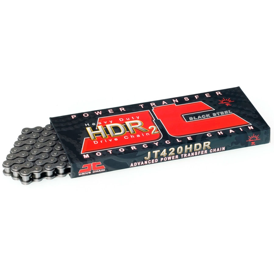 Cadena JT Chain 420 HDR 116 Pasos. La cadena JT Chain HDR es la más básica, dentro de la gama de cadenas de moto sin retenes. Esta cadena ha sido diseñada para motos de carretera, motocross y quads de uso normal de hasta 350cc (dependiendo del paso). Las cadenas JT Chain HDR Heavy Duty sin retenes están disponibles en 420, 428 y 520, para que encuentres la cadena necesaria de acuerdo a tu moto.