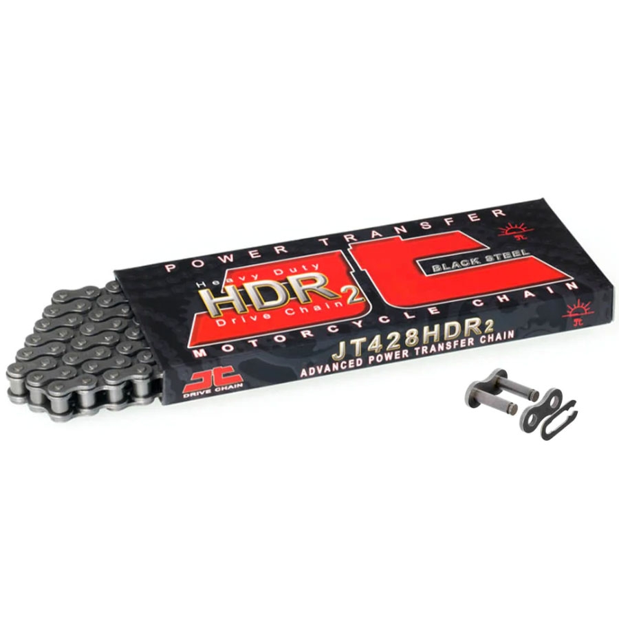 Cadena JT Chain 428 HDR 122 Pasos. La cadena JT Chain HDR es la más básica, dentro de la gama de cadenas de moto sin retenes. Esta cadena ha sido diseñada para motos de carretera, motocross y quads de uso normal de hasta 350cc (dependiendo del paso). Las cadenas JT Chain HDR Heavy Duty sin retenes están disponibles en 420, 428 y 520, para que encuentres la cadena necesaria de acuerdo a tu moto.