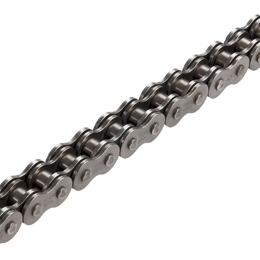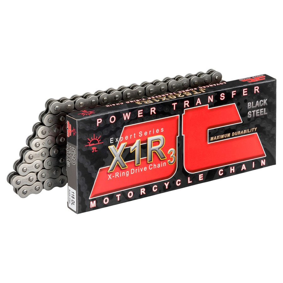 Cadena JT Chain 520 X1R3 78 Pasos. La cadena JT Chain X1R X-Ring posee una resistencia al desgaste excepcional. El sistema de sellado X-Ring con cuatro puntos de contacto (Aros en X) y patentados por JT incrementan enormemente la capacidad de sellado, impiden la entrada de suciedad y la salida del lubricante es mucho mayor que en cualquier otra cadena de moto. Además, las cadenas con X-Ring tienen mayor resistencia al desgaste que el resto de cadenas. La construcción de las cadenas JT Chain con sistema X-Ring garantizan una reducción de la fricción, ya que su acción de giro distribuye la presión y minimiza la pérdida de potencia. El cierre se realiza mediante remache.