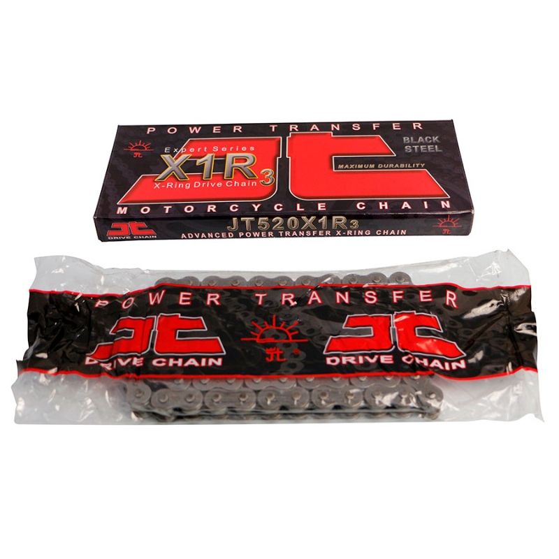 Cadena JT Chain 520 X1R3 Natural 114 Pasos. La cadena JT Chain X1R3 X-Ring posee una resistencia al desgaste excepcional. El sistema de sellado X-Ring con cuatro puntos de contacto (Aros en X) y patentados por JT incrementan enormemente la capacidad de sellado, impiden la entrada de suciedad y la salida del lubricante es mucho mayor que en cualquier otra cadena de moto. Además, las cadenas con X-Ring tienen mayor resistencia al desgaste que el resto de cadenas. La construcción de las cadenas JT Chain con sistema X-Ring garantizan una reducción de la fricción, ya que su acción de giro distribuye la presión y minimiza la pérdida de potencia. El cierre se realiza mediante remache.