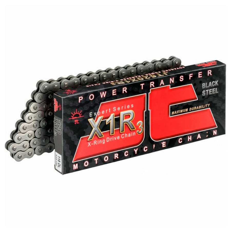 Cadena JT Chain 520 X1R3 Nickel 116 Pasos. La cadena JT Chain X1R3 X-Ring posee una resistencia al desgaste excepcional. El sistema de sellado X-Ring con cuatro puntos de contacto (Aros en X) y patentados por JT incrementan enormemente la capacidad de sellado, impiden la entrada de suciedad y la salida del lubricante es mucho mayor que en cualquier otra cadena de moto. Además, las cadenas con X-Ring tienen mayor resistencia al desgaste que el resto de cadenas. La construcción de las cadenas JT Chain con sistema X-Ring garantizan una reducción de la fricción, ya que su acción de giro distribuye la presión y minimiza la pérdida de potencia. El cierre se realiza mediante remache.
