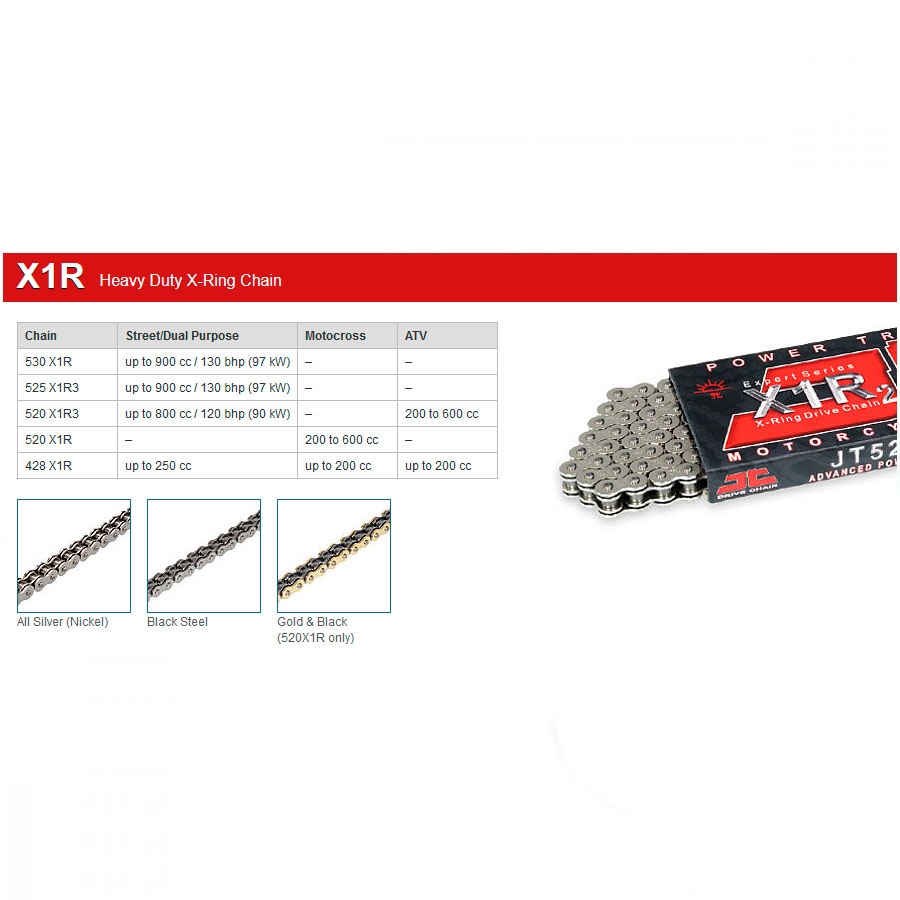 Cadena JT Chain 530 X1R 110 Pasos. La cadena JT Chain X1R X-Ring posee una resistencia al desgaste excepcional. El sistema de sellado X-Ring con cuatro puntos de contacto (Aros en X) y patentados por JT incrementan enormemente la capacidad de sellado, impiden la entrada de suciedad y la salida del lubricante es mucho mayor que en cualquier otra cadena de moto. Además, las cadenas con X-Ring tienen mayor resistencia al desgaste que el resto de cadenas. La construcción de las cadenas JT Chain con sistema X-Ring garantizan una reducción de la fricción, ya que su acción de giro distribuye la presión y minimiza la pérdida de potencia. El cierre se realiza mediante remache.