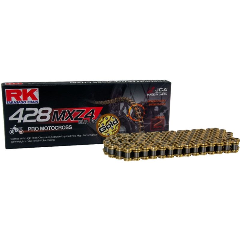 Cadena RK 428MXZ4 con 136 Eslabones Enganche Clip Rápido en Color Oro. Cadena RK 428MXZ4 con 136 eslabones – Color oro – Paso 428 – Offroad hasta 150 cc. La RK 428MXZ4 es una cadena de alto rendimiento diseñada para motos offroad de hasta 150 cc, ideal para motocross, enduro o supermoto ligera. Con un diseño robusto y sin retenes, destaca por su resistencia, ligereza y rápida respuesta, y su acabado en color oro le aporta además un toque deportivo y visualmente atractivo.