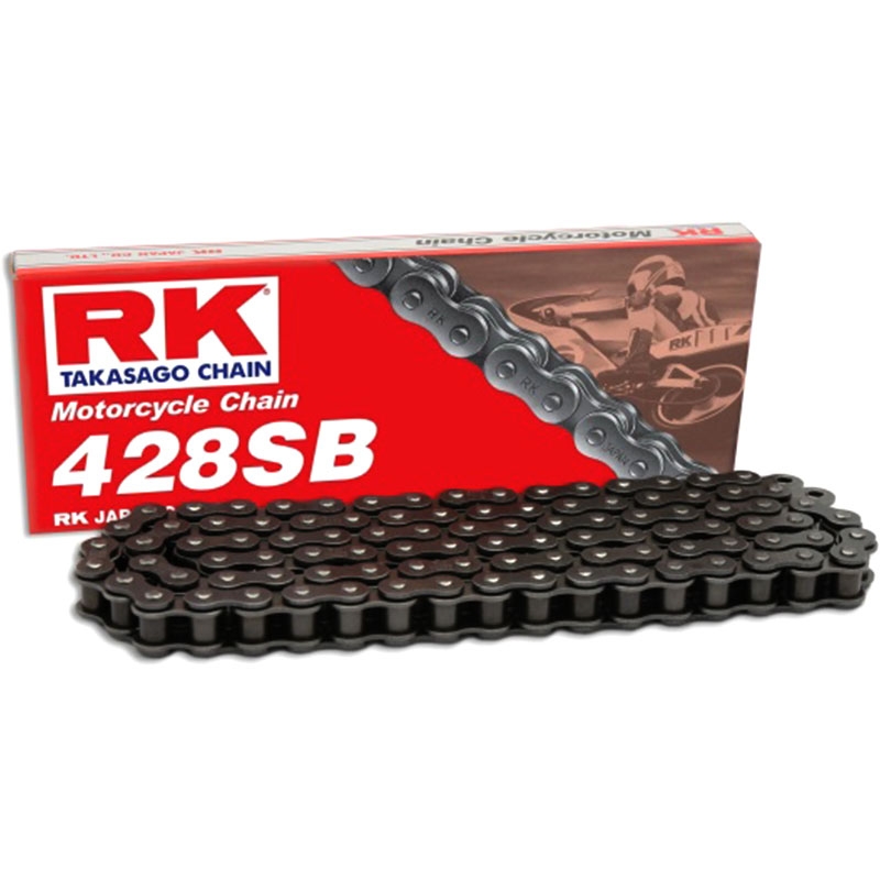 Cadena RK 428SB con 132 Eslabones Enganche Clip Rápido. Cadena RK Chain 428SB con enganche tipo clip – Sencillez y resistencia para motos ligeras. La RK Chain 428SB forma parte de la gama Standard Series, una opción económica y fiable para motos de hasta 125 cc en uso offroad o 150 cc en carretera. Fabricada en acero al carbono de grado medio, esta cadena es perfecta para motos ligeras, scooters o motocicletas de pequeña cilindrada que no requieren un sistema de retén avanzado.