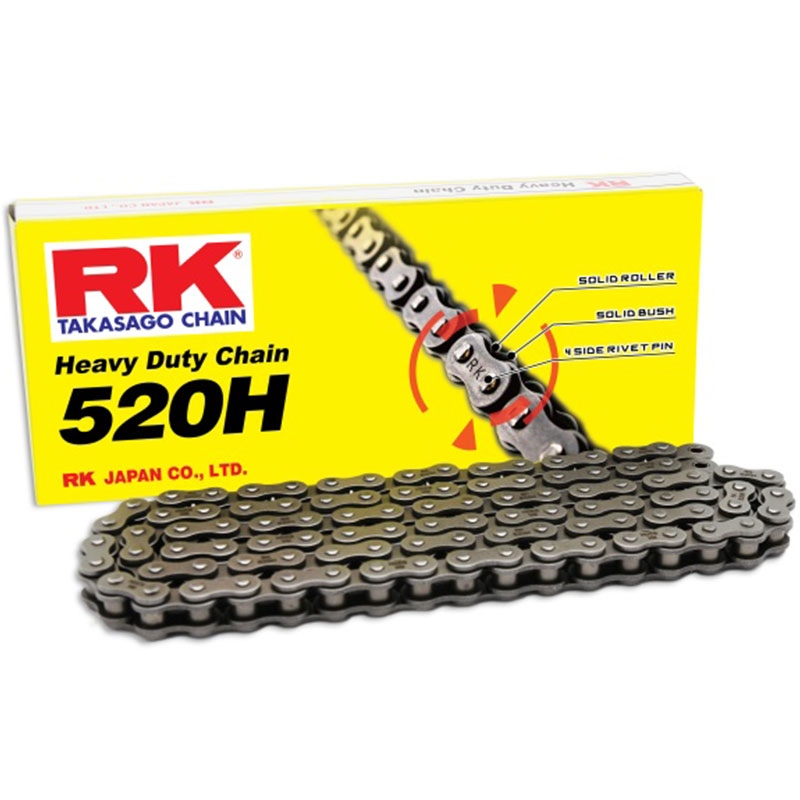 Cadena RK 520H con 114 Eslabones Enganche Clip Rápido. Cadena RK Chain 520H con clip – Robusta, sencilla y con excelente relación calidad-precio. La RK 520H es una cadena sin retenes pensada para quienes buscan durabilidad y resistencia en motos de hasta 250 cc offroad o 400 cc en carretera. Con una construcción reforzada y tratamiento térmico, esta cadena supera en prestaciones a las cadenas estándar de su categoría, convirtiéndola en una gran elección para motos de uso intensivo o habitual.