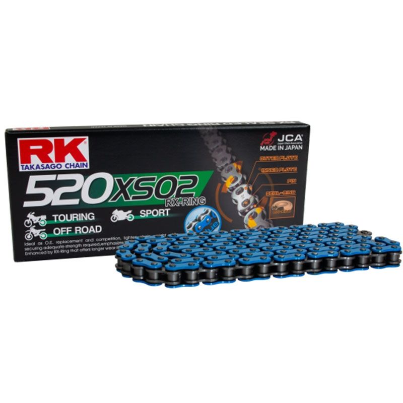 Cadena RK 520XSO con 120 Eslabones Enganche para Remachar en Color Azul. Cadena RK 520XSO con 120 eslabones – Enganche para remachar – Colores: verde, rojo, naranja y azul. La cadena RK 520XSO es una opción robusta y duradera para motos on-road de hasta 750 cc, diseñada para quienes buscan un rendimiento fiable y un mantenimiento reducido. Disponible en cuatro colores llamativos (verde, rojo, naranja y azul), combina funcionalidad con estética para adaptarse al estilo de cada motocicleta.