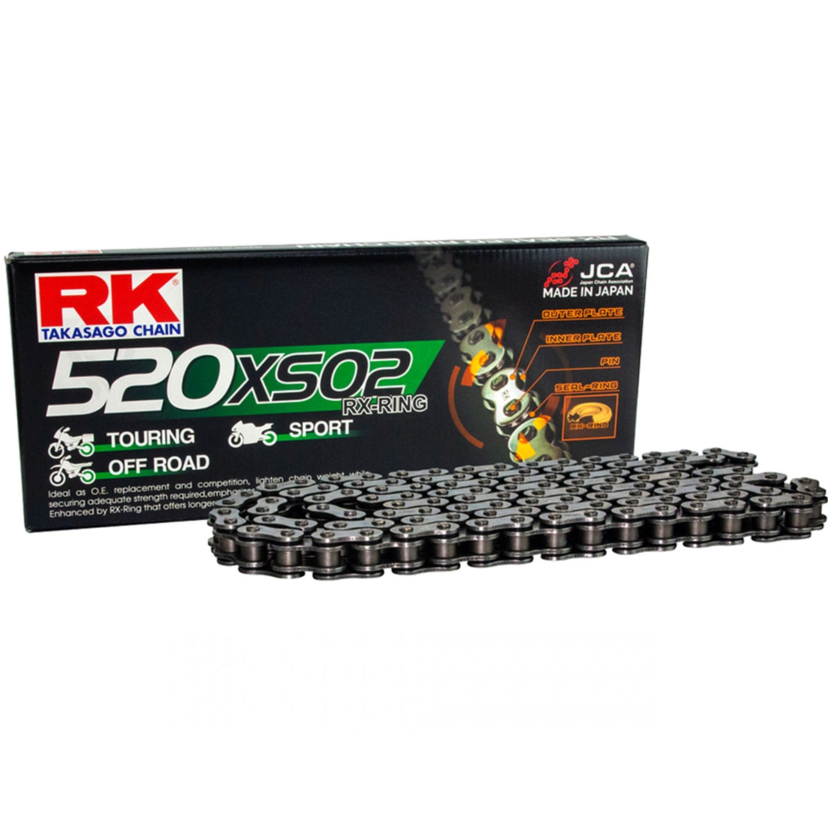 Cadena RK 520XSO2 con 102 Eslabones Enganche para Remachar. Cadena RK 520XSO2 – Equilibrio perfecto entre durabilidad, suavidad y precio. La RK 520XSO2 es una cadena de moto reforzada con retenes XW-Ring, especialmente diseñada para motos de hasta 750 cc que requieren un alto rendimiento tanto en ciudad como en carretera. Es la evolución mejorada de la popular 520XSO, con mayor eficiencia en el sellado y una vida útil más prolongada.