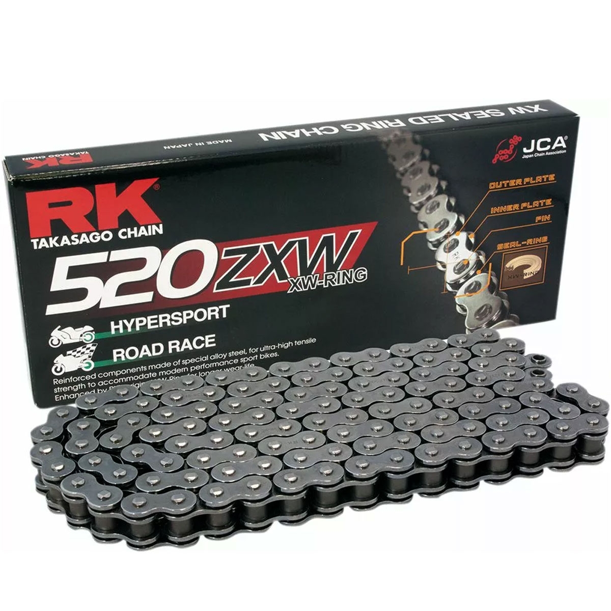 Cadena RK 520ZXW con 108 Eslabones Enganche para Remachar. Cadena RK 520ZXW con enganche de remache – Máxima resistencia para motos de alto rendimiento. La RK 520ZXW es la cadena de transmisión reforzada más avanzada de la marca japonesa RK, diseñada para motos de hasta 1200 cc de uso en carretera y hasta 750 cc en offroad. Gracias a su innovador diseño XW-Ring, proporciona mayor durabilidad, resistencia al calor y una respuesta inmediata al acelerador, ideal para motos deportivas de altas prestaciones.