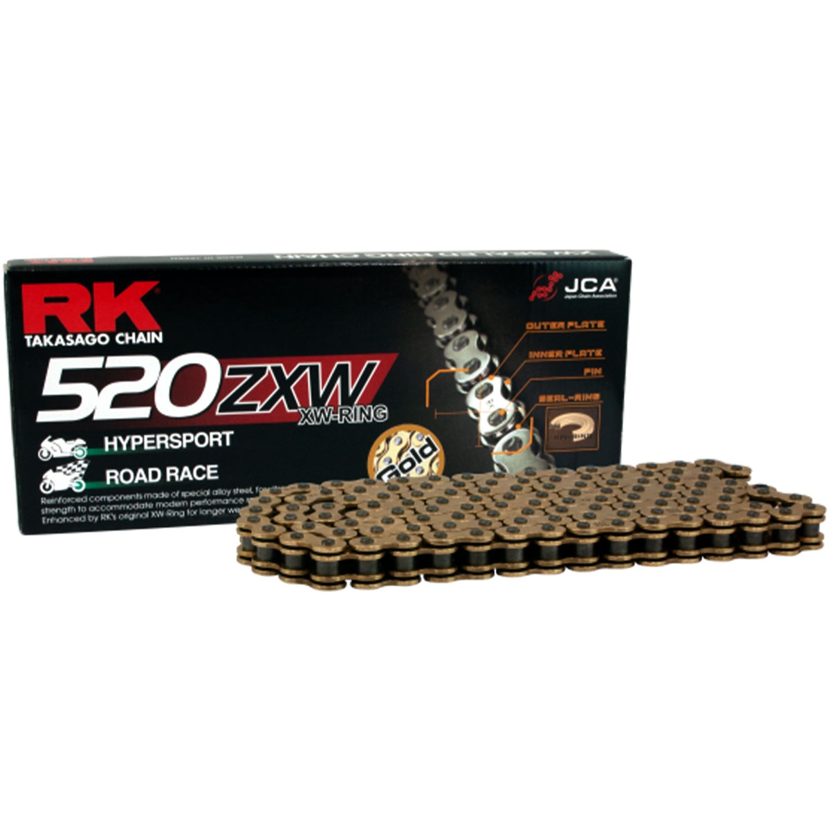 Cadena RK 520ZXW con 114 Eslabones Enganche para Remachar en Color Oro. Cadena RK 520ZXW con enganche de remache – Máxima resistencia para motos de alto rendimiento. La RK 520ZXW es la cadena de transmisión reforzada más avanzada de la marca japonesa RK, diseñada para motos de hasta 1200 cc de uso en carretera y hasta 750 cc en offroad. Gracias a su innovador diseño XW-Ring, proporciona mayor durabilidad, resistencia al calor y una respuesta inmediata al acelerador, ideal para motos deportivas de altas prestaciones.