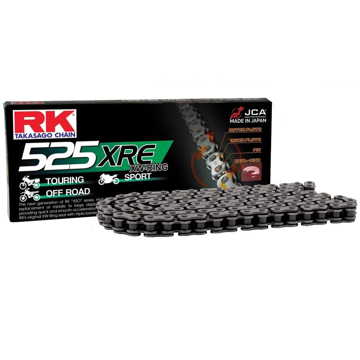 Cadena RK 525XRE con 122 Eslabones con Enganche para Remachar. Cadena de moto RK Chain 525XRE – Rendimiento fiable en carretera y offroad en Ramirez Moto. La RK 525XRE es una cadena de transmisión reforzada de tipo estándar, diseñada para ofrecer un rendimiento duradero en motos de hasta 900 cc en uso onroad y hasta 400 cc en uso offroad. Su equilibrio entre ligereza, resistencia y fiabilidad la convierte en una excelente opción tanto para motos sport, naked, touring o trail de media cilindrada.