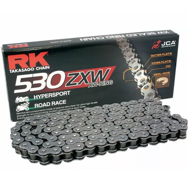 Cadena RK 530ZXW con 122 Eslabones Enganche para Remachar. Cadena RK 530ZXW con enganche para remachar – Máxima resistencia para motos de altas prestaciones. La RK 530ZXW es una cadena de transmisión de altísimo rendimiento, diseñada específicamente para motos de gran cilindrada de hasta 1400 cc. Con tecnología XW-Ring de triple barrera y materiales de primera calidad, esta cadena ofrece máxima durabilidad, menor desgaste y una respuesta inmediata en aceleración.