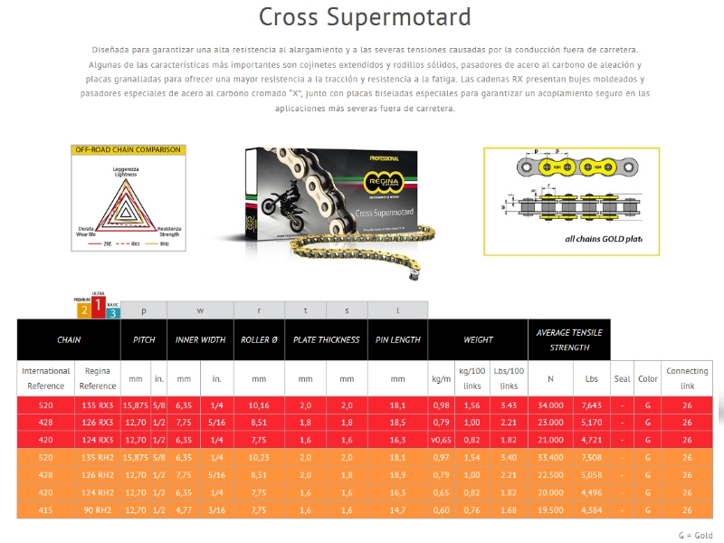 Cadena Regina 420 RH2 Cross Supermotard 110 Pasos 124RH2 RG420RH2X110. La cadena Regina RH2 Cross Supermotard dispone de un buje especial moldeado que elimina el efecto barril que producen los ensamblados de los bujes tipo estándar. El resultado es un contacto total entre los casquillos y los pasadores a lo largo de toda la longitud, reduciendo la presión de contacto específica y por lo tanto también un desgaste menor. La cadena Regina RH2 Cross Supermotard también se caracteriza por los sus pasadores cromados que proporcionan una excelente dureza de la superficie de los pasadores. Esto va directamente vinculado con una mayor resistencia al desgaste y a mayor resistencia a los golpes. La cadena Regina RH2 Cross Supermotard se suministra con cierre de clip (tipo 26). Recomenda para motos con cilindrada desde 50cc hasta 85cc con paso 420.