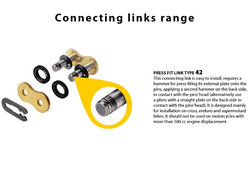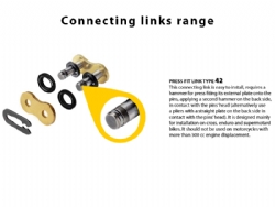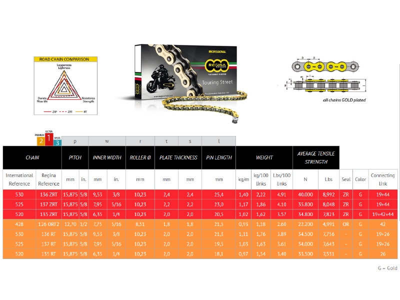 Cadena Regina 428 ORT2 Touring Street 130 Pasos 126ORT2/006 RG428ORT2X130. La cadena Regina 428 ORT2 Touring Street posee un diseño especial para motos de turismo de hasta 250cc. Proporciona un elevado kilometraje con un alargamiento mínimo, gracias al sellado O-Ring patentado por Regina. Posee un tratamiento color oro que prolonga su duración y resistencia. La cadena ORT2 Touring Street está ensamblada con casquillos y rodillos macizos, granallado de placas, pasadores y rodillos que maximizan la resistencia a la fatiga. Además ha sido sometida a un previo estiramiento para optimizar su rendimiento. Se suministra con cierre de clip (Tipo 42).