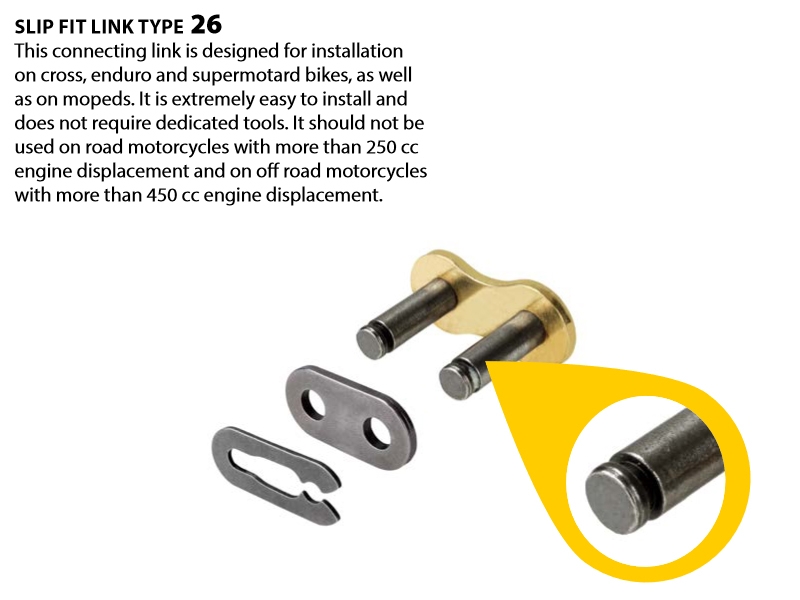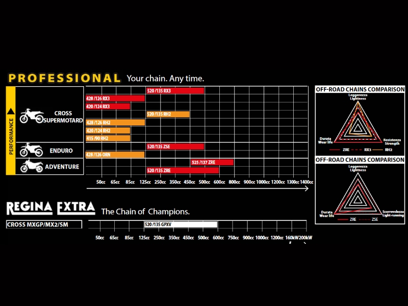 Cadena Regina 428 RH2 Cross Supermotard 130 Pasos 126RH2/020 RG428RH2X130. La cadena Regina RH2 Cross Supermotard dispone de un buje especial moldeado que elimina el efecto barril que producen los ensamblados de los bujes tipo estándar. El resultado es un contacto total entre los casquillos y los pasadores a lo largo de toda la longitud, reduciendo la presión de contacto específica y por lo tanto también un desgaste menor. La cadena Regina RH2 Cross Supermotard también se caracteriza por los sus pasadores cromados que proporcionan una excelente dureza de la superficie de los pasadores. Esto va directamente vinculado con una mayor resistencia al desgaste y a mayor resistencia a los golpes. La cadena Regina RH2 Cross Supermotard se suministra con cierre de clip (tipo 26). Recomenda para motos con cilindrada entre 50cc hasta 125cc con paso 428.