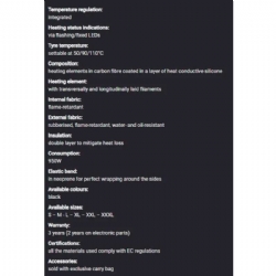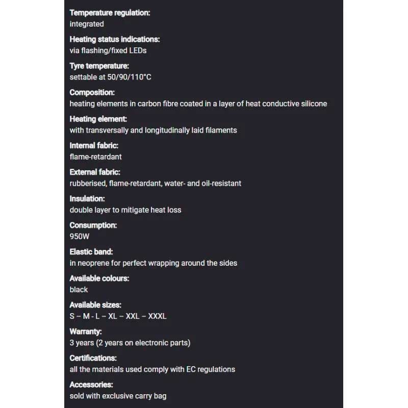 Fabricados con tejidos ignífugos interiores y exteriores, integran elementos calefactores de fibra de carbono dispuestos de forma transversal y longitudinal, recubiertos de silicona conductora térmica. Su triple aislamiento con capa reflectante minimiza la pérdida de calor, logrando un calentamiento más rápido, homogéneo y seguro. Cada set incluye bolsa de transporte tipo maleta.