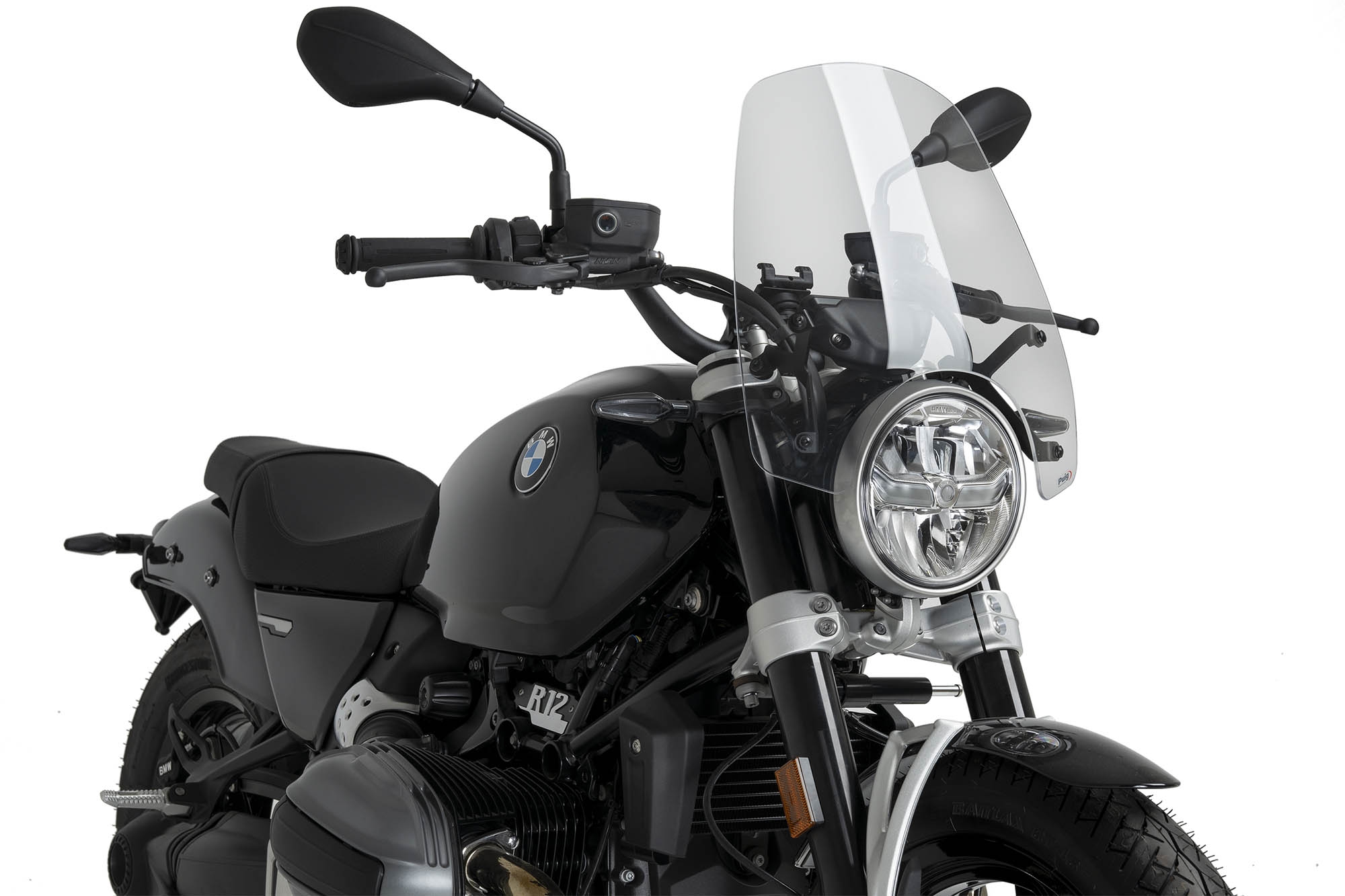 Su diseño combina una superficie central plana que asegura visibilidad óptima con formas laterales estudiadas para desviar eficazmente el aire, protegiendo también las manos del piloto. El encaje inferior se adapta perfectamente al faro de la R12 Nine T, manteniendo una estética limpia y coherente con el diseño original de la moto.