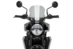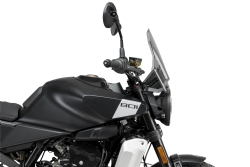 Su diseño presenta una superficie central plana que asegura visibilidad óptima, mientras que sus formas laterales actúan como deflectores, desviando el aire de las manos y aumentando la comodidad en la conducción. Además, la parte inferior se ajusta al faro y conecta con el tacómetro, logrando una integración estética impecable con el frontal de la moto.