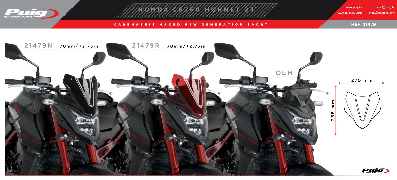 Carenabris Puig 21479R Naked New Generation Sport Honda CB 750 Hornet 2023. Parabrisas Puig 21479 Naked New Generation específica para la nueva Honda CB 750 Hornet 2023 y que gracias a su metracrilato de alto impacto con grosor de 3 mm, ofrece una gran resistencia y excelente fijación a la moto. Esta cúpula ha sido perfectamente estudiada para mejorar la protección del motorista contra el viento.