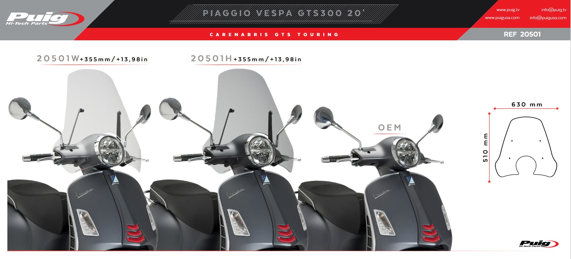 Carenabris Puig GTS Touring 20501H Piaggio Vespa GTS 300 2021. El nuevo Carenabrís Puig GTS Touring para la Piaggio Vespa GTS ha sido diseñado para potenciar la protección aerodinámica de tu moto, salvaguardando la línea estética de un modelo emblemático de motocicleta. Líneas redondeadas y elegantes, disponible en varios colores, garantizarán mantener la imagen neo-retro de un modelo clásico de moto y añadir un plus adicional de seguridad en rutas con condiciones climáticas adversas.
