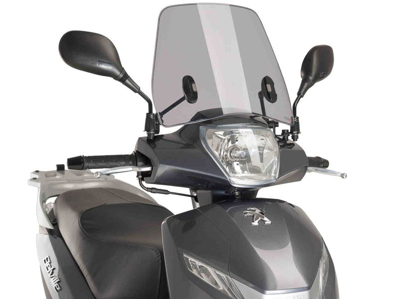 Carenabris Cúpula Puig 9967H Trafic Scooter Peugeot BELVILLE 125 2017. El carenabrís Puig Trafic ofrece un diseño más bajo que el carenabrís más popular de Puig, el modelo T.S. El Trafic mantiene un diseño urbano y es ideal para protegerse del viento y el frío. Está realizado en policarbonato de 3 mm resistente y disponible en color transparente (W) y ahumado claro (H). Realizado en policarbonato de 3 mm resistente, está disponible en color transparente (W) y ahumado claro (H).