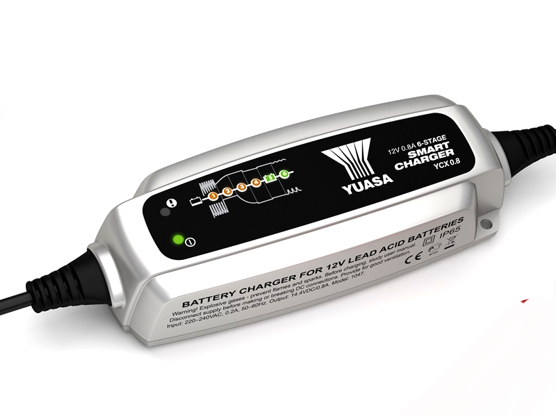 Cargador Batería Yuasa YCX 0.8 Smart Charger. El cargador de baterías YCX 0.8, es perfecto para cargar pequeñas baterías de 12V incluyendo motocicletas, motos de agua, ATVs y cortadoras de césped. Indicado para mantener la carga de la batería de un vehículo de tamaño normal, LCV y coches deportivos. YCX 0.8 12V, está diseñado para la carga de baterías más pequeñas (1,2 a 32 Ah). Un cargador de seis pasos compacto y totalmente automático. El YCX 0.8 de Yuasa también se puede utilizar para el mantenimiento de la carga de baterías de automóviles de hasta 100 Ah.