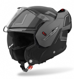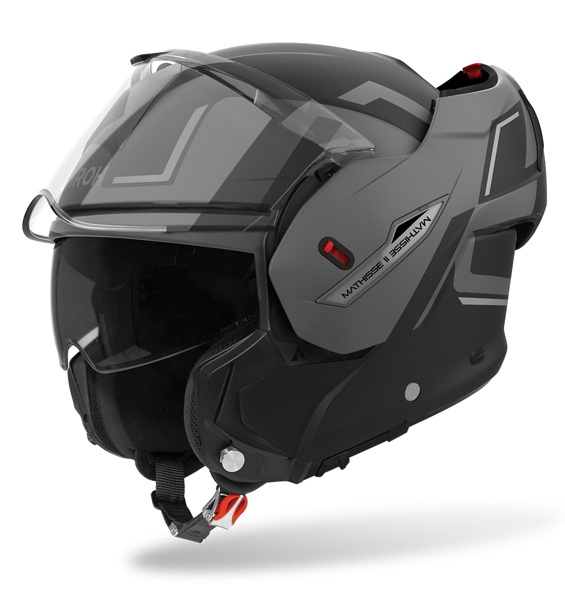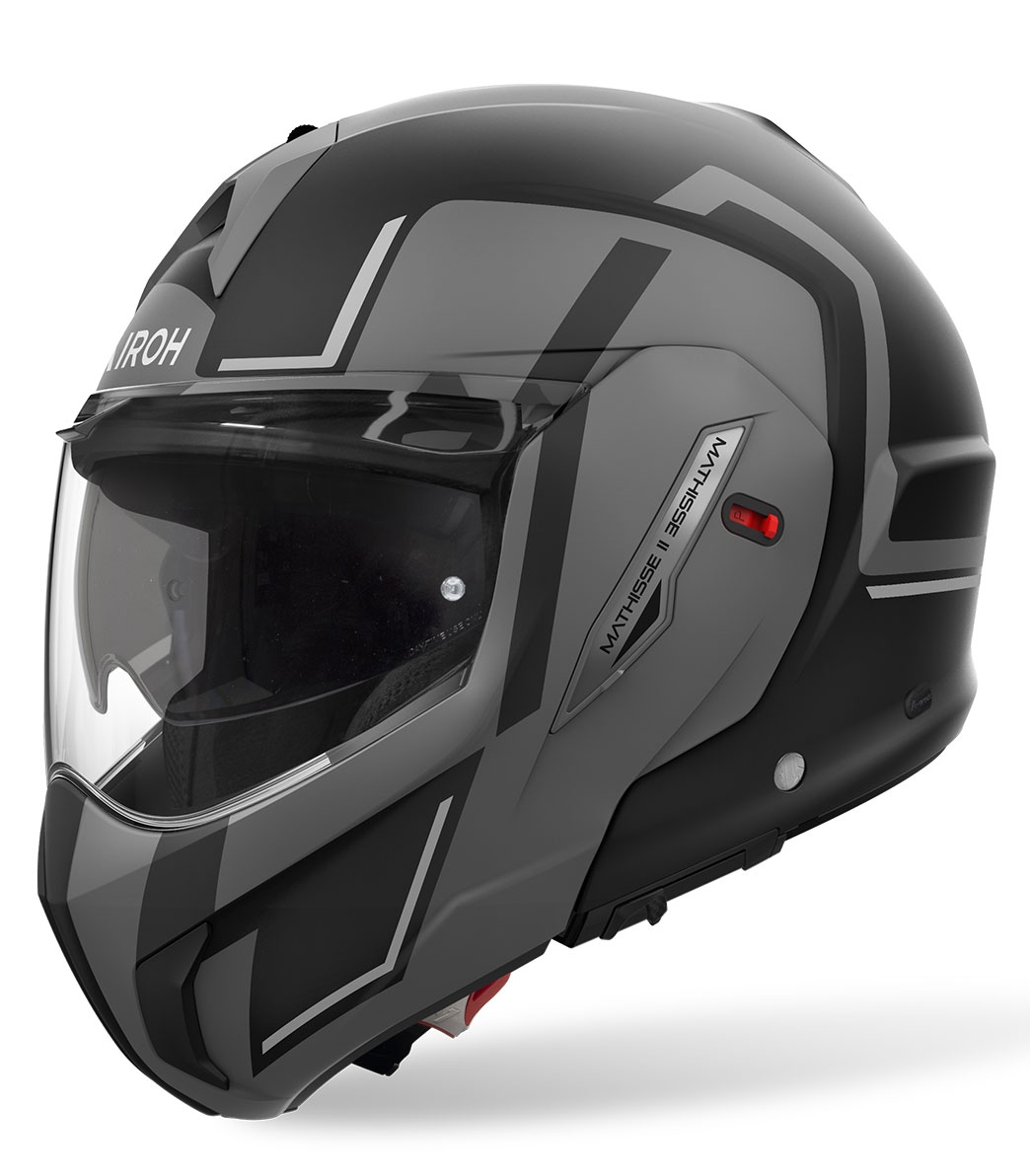 Casco Airoh Mathisse II Genius Gris Mate. Casco modular Airoh Mathisse II: versatilidad y estilo para cada aventura. El casco modular Airoh Mathisse II redefine la experiencia del motociclista con un diseño 2 en 1, permitiendo un cambio sencillo entre las configuraciones de casco cerrado y abierto. Este modelo, homologado bajo la normativa ECE 22.06 con certificación P/J, es el compañero ideal para quienes buscan versatilidad, comodidad y estilo en cualquier contexto, desde trayectos urbanos hasta viajes largos.