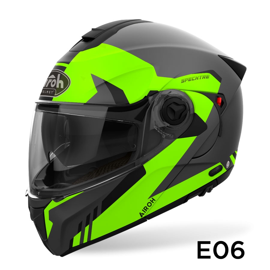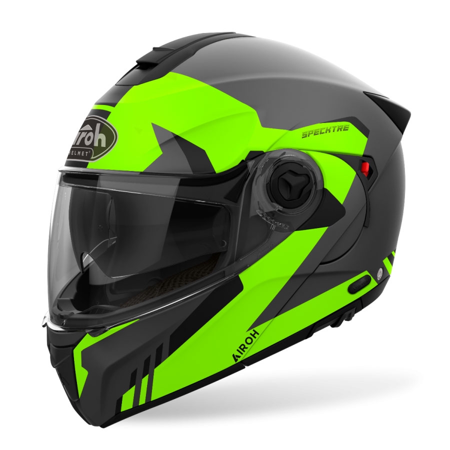 Casco Airoh Specktre Clever Amarillo Mate. Presentamos el Airoh Specktre, un casco modular excepcionalmente funcional y adaptable. Reconocido por su doble homologación y su capacidad para enfrentarse a cualquier circunstancia, el Specktre brilla por su amplia visera equipada con un pinlock y una pantalla solar interna. El casco Airoh Specktre Clever, con homologación ECE 22.06, se fabrica con HRT (termoplástico de alta resistencia). Este casco destaca por su cierre micrométrico, su visera solar interior y su pantalla extra ancha preparada para Bluetooth. Está equipado con un sistema Stop Wind y una lente Pinlock, lo que lo convierte en un compañero de viaje ideal para motociclistas urbanos y aventureros.
