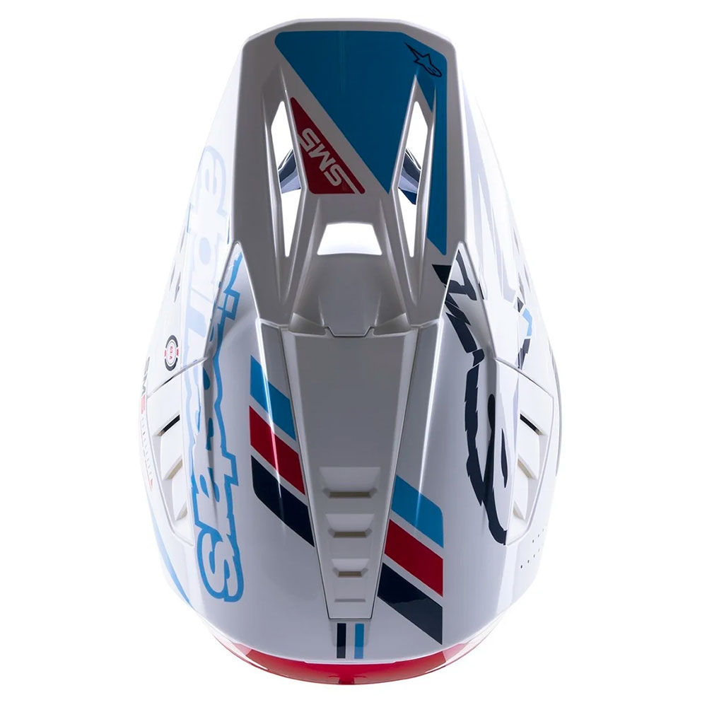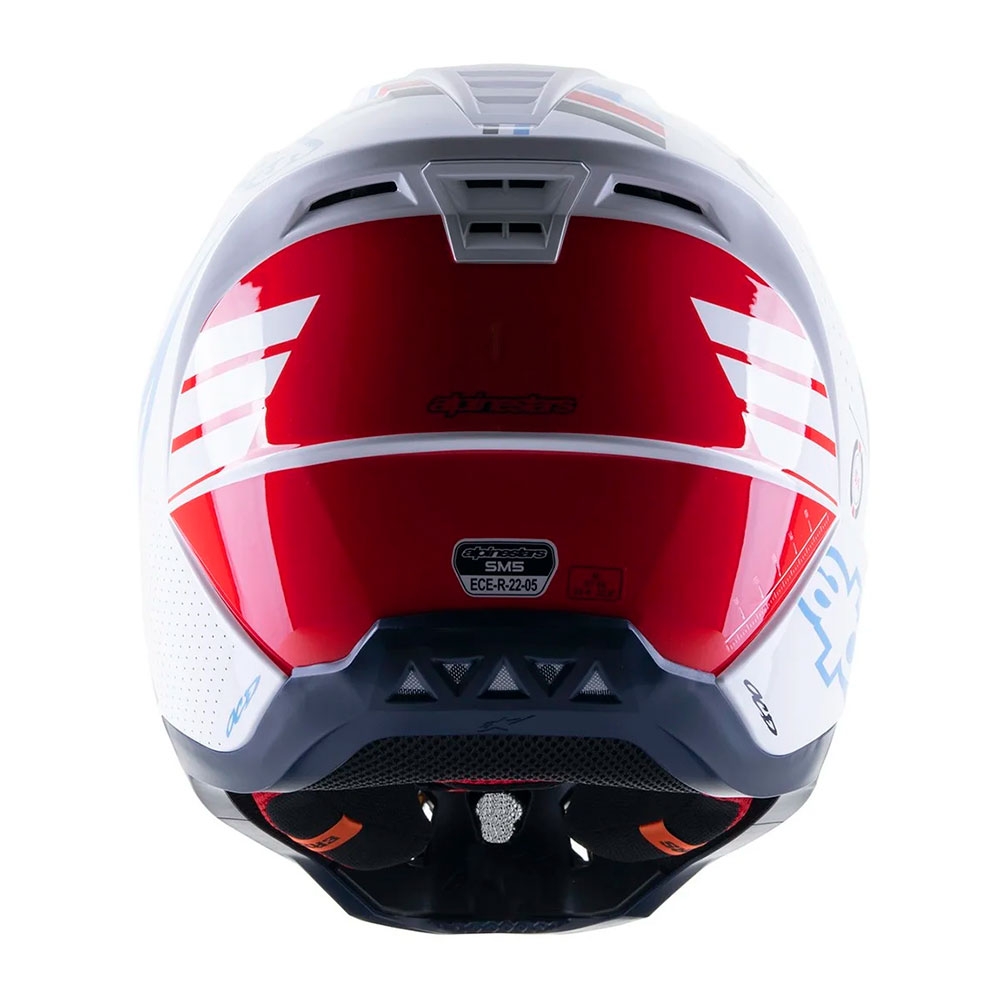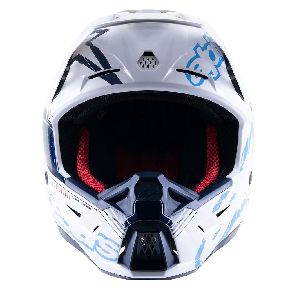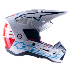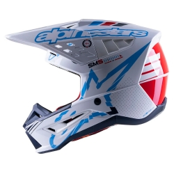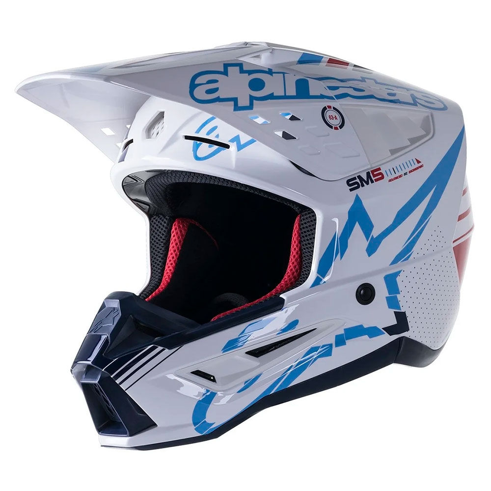 Casco Alpinestars S-M5 Action Blanco / Cyan / Azul Oscuro. Tras varios años de estudio, desarrollos y pruebas, Alpinestars presenta el nuevo casco de motocross S-M5, que ofrece una excelente, seguridad, ventilación y confort. La calota exterior se presenta en 2 tamaños distintos y está fabricada en polímero termo inyectado con grados de grosor variables. Sistema de ventilación muy eficiente, posibilidad de incorporar un kit de hidratación, interior desmontable con sistema de emergencia o la visera especialmente diseñada para desprenderse en caso de caída, son algunas de las características más destacadas del casco Alpinestars S-M5.