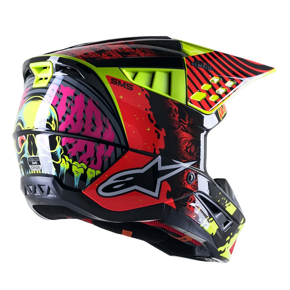 Casco Alpinestars S-M5 Solar Flare Negro / Rojo Fluor / Amarillo Fluor. Tras varios años de estudio, desarrollos y pruebas, Alpinestars presenta el nuevo casco de motocross S-M5, que ofrece una excelente, seguridad, ventilación y confort. La calota exterior se presenta en 2 tamaños distintos y está fabricada en polímero termo inyectado con grados de grosor variables. Sistema de ventilación muy eficiente, posibilidad de incorporar un kit de hidratación, interior desmontable con sistema de emergencia o la visera especialmente diseñada para desprenderse en caso de caída, son algunas de las características más destacadas del casco Alpinestars S-M5.