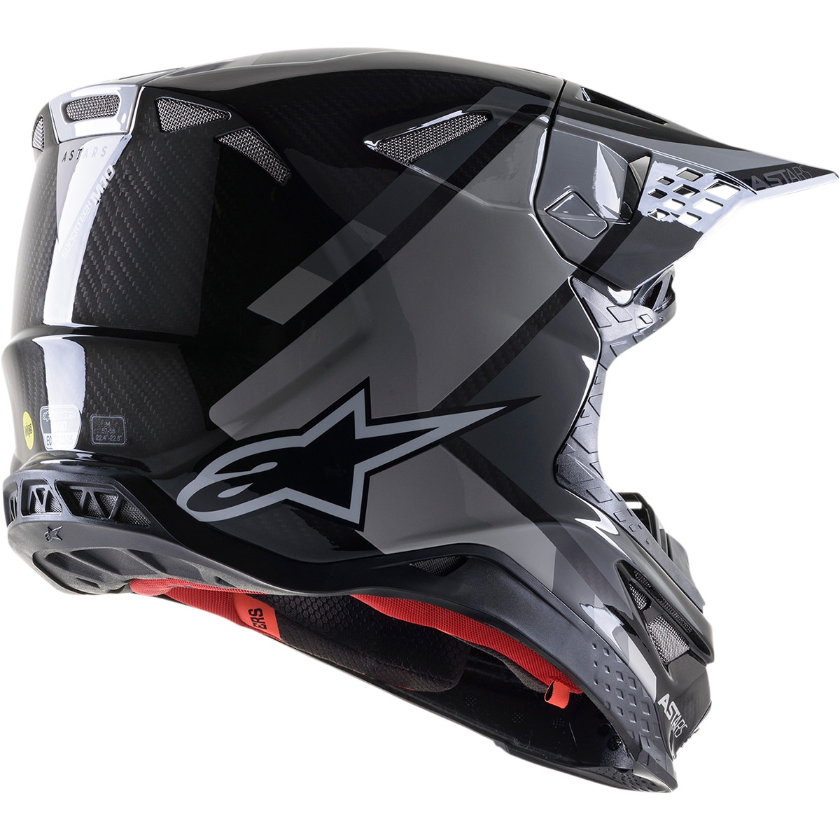Casco Alpinestars Supertech M10 Carbon Negro / Gris. El nuevo Alpinestars Supertech S-M10 se presenta como uno de los cascos de motocross más avanzados y tecnológicos que existen. Su diseño se caracteriza por ser agresivo y destaca por su ligereza y por su sistema de protección MIPS E-2. El casco Alpinestars Supertech S-M10 también introduce la nueva tecnología A-Head, diseñada para proporcionar un ajuste altamente personalizable. Este casco off-road dispone de un avanzado sistema de ventilación compuesto por numerosas entradas y salidas de aire para una refrigeración interna de alto nivel.