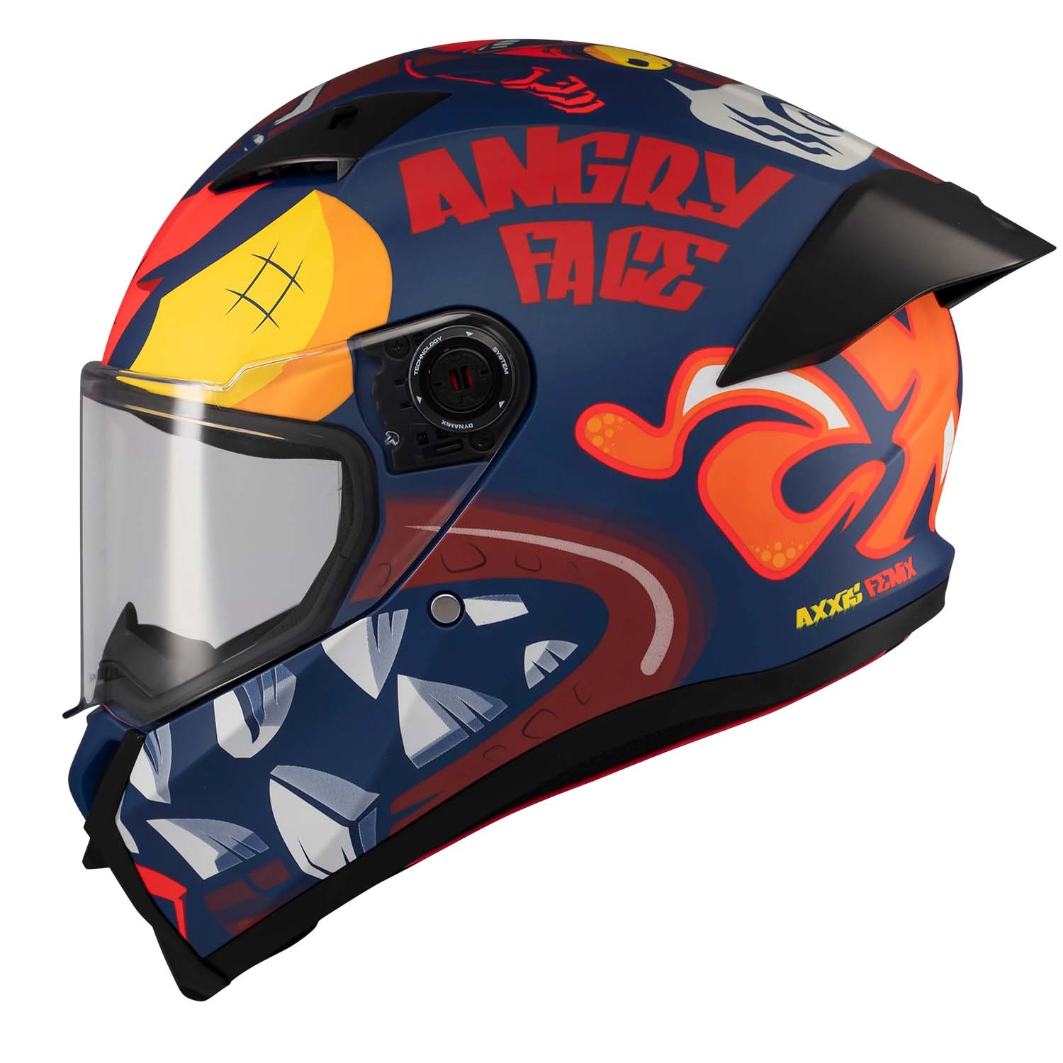 Casco Axxis Fenix Angry Face Azul / Naranja Mate. El Axxis Fenix llega a Ramirez Moto como uno de los lanzamientos más esperados de 2025. Diseñado para dominar la ciudad, este casco integral combina una estética agresiva con prestaciones técnicas de última generación. Su gráfica exclusiva Angry Face y las tres combinaciones de color disponibles —Azul, Gris y Rojo— lo convierten en una pieza única tanto en imagen como en rendimiento.