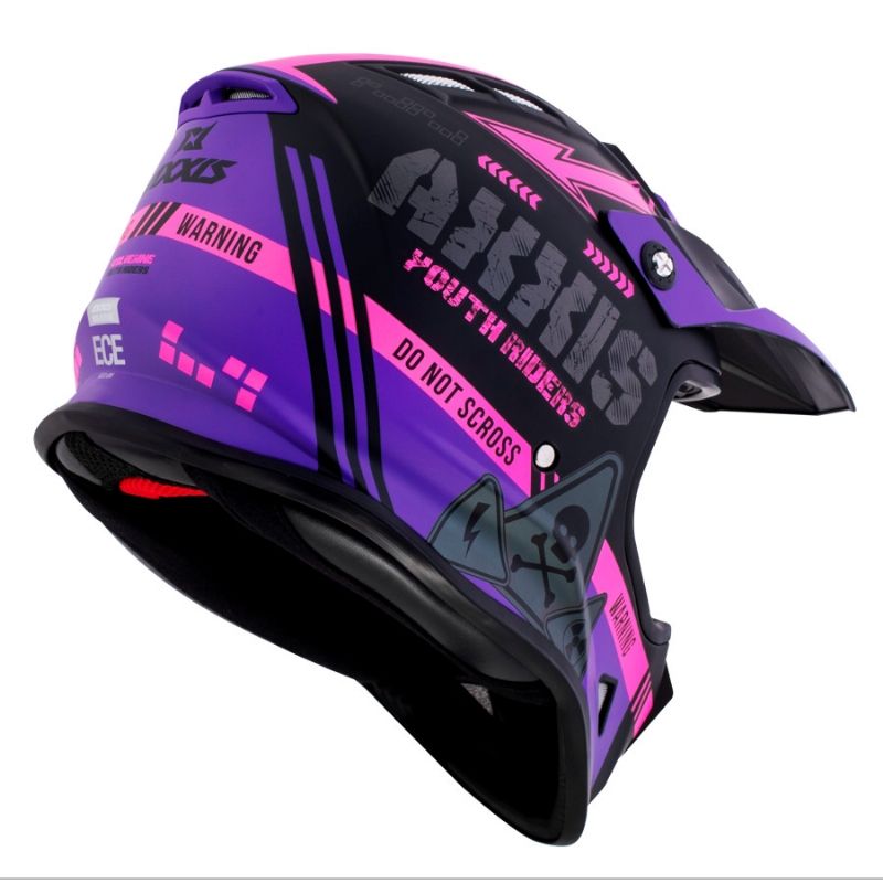 Casco Axxis MX-Kids Wolverine B8 Rosa Mate. MX-Kids Wolverine es el primer casco infantil de Axxis diseñado específicamente para uso en off-road. El nuevo Axxis MX-Kids Wolverine ofrece altos niveles de seguridad junto con un precio reducido, lo que hace que sea una de las mejores opciones del mercado para iniciar a niños y niñas en el mundo del motocross. La calota exterior cuenta con un diseño compacto y está fabricada en termoplástico inyectado, lo que le confiere ligereza y resistencia a los impactos. El casco Axxis MX-Kids Wolverine dispone de sistema de retención con cierre micrométrico. Además, posee la homologación ECE 22.05, lo que garantiza seguridad y confort para los más pequeños.