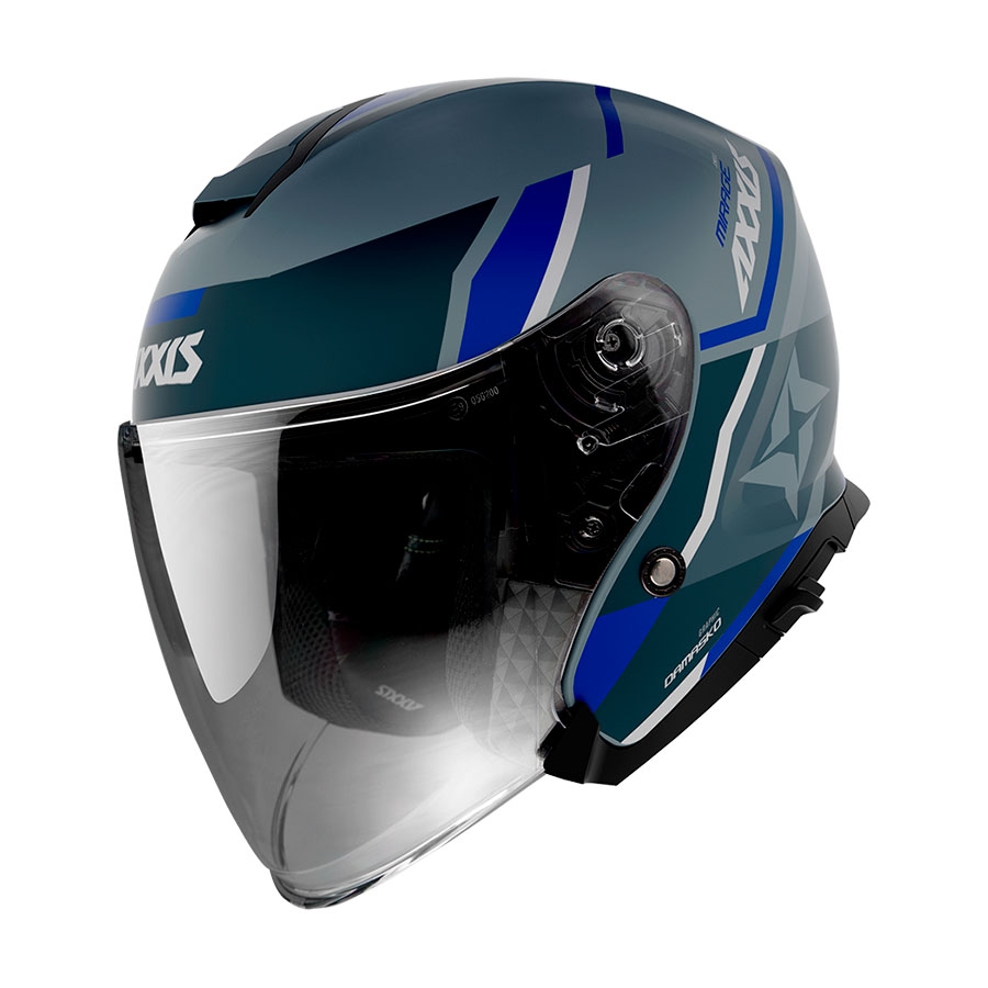 Casco Axxis OF504SV Mirage SV Damasko D7 Azul Mate. El casco Mirage SV es un modelo jet con pantalla solar integrada. Este casco urbano ofrece una calota fabricada en ABS disponible en dos tamaños para garantizar un ajuste y protección de primer nivel. El cierre es micrométrico muy fácil de utilizar, incluso con los guantes puestos. El casco esta preparado para su uso con gafas de vista y se suministra con pantalla transparente. Peso calota pequeña 1350 ± 50 gr / calota grande 1450 ± 50 gramos.