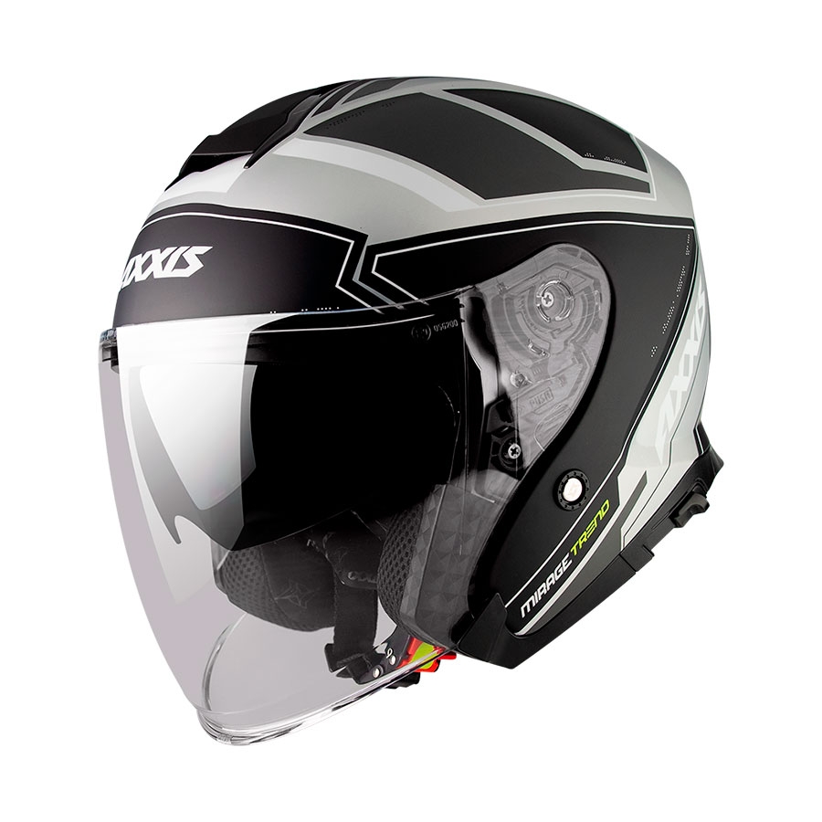 Casco Axxis OF504SV Mirage SV Trend C2 Gris Mate. El casco Mirage SV es un modelo jet con pantalla solar integrada. Este casco urbano ofrece una calota fabricada en ABS disponible en dos tamaños para garantizar un ajuste y protección de primer nivel. El cierre es micrométrico muy fácil de utilizar, incluso con los guantes puestos. El casco esta preparado para su uso con gafas de vista y se suministra con pantalla transparente. Peso calota pequeña 1350 ± 50 gr / calota grande 1450 ± 50 gramos.