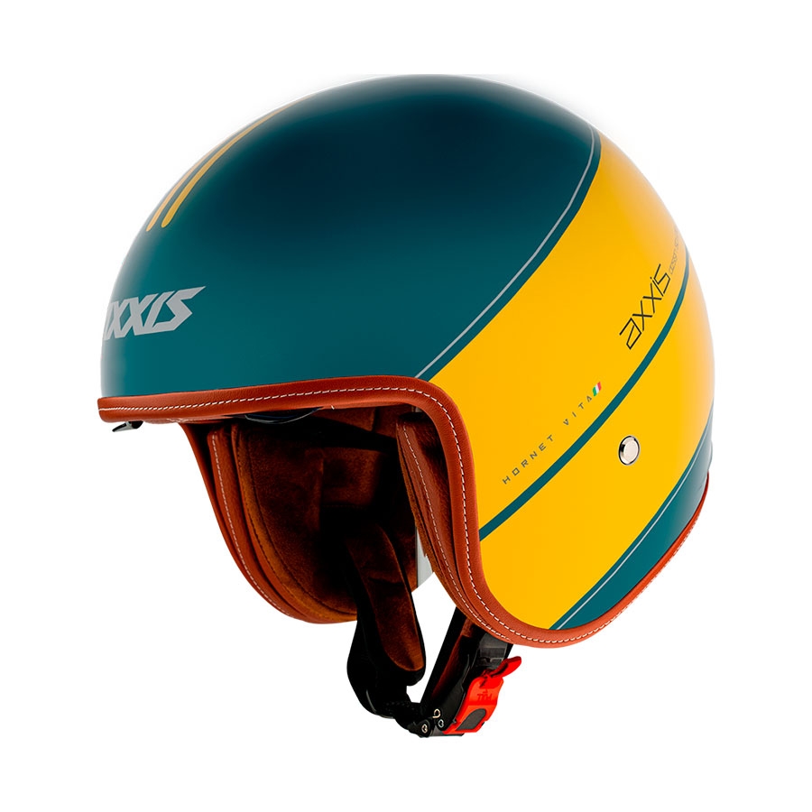 Casco Axxis OF507SV Hornet SV Vita C3 Amarillo Mate. El casco jet Axxis Hornet SV posee un diseño retro muy elegante. Este modelo por su estética y su precio contenido, se convierte en una de las mejores opcionas si valoramos la compra de este tipo de cascos. La construcción de la calota externa se ha realizado en ABS y dispone de dos tamaños para un mejor ajuste; el cierre es micrométrico, muy fácil de utilizar y dispone de visor solar.