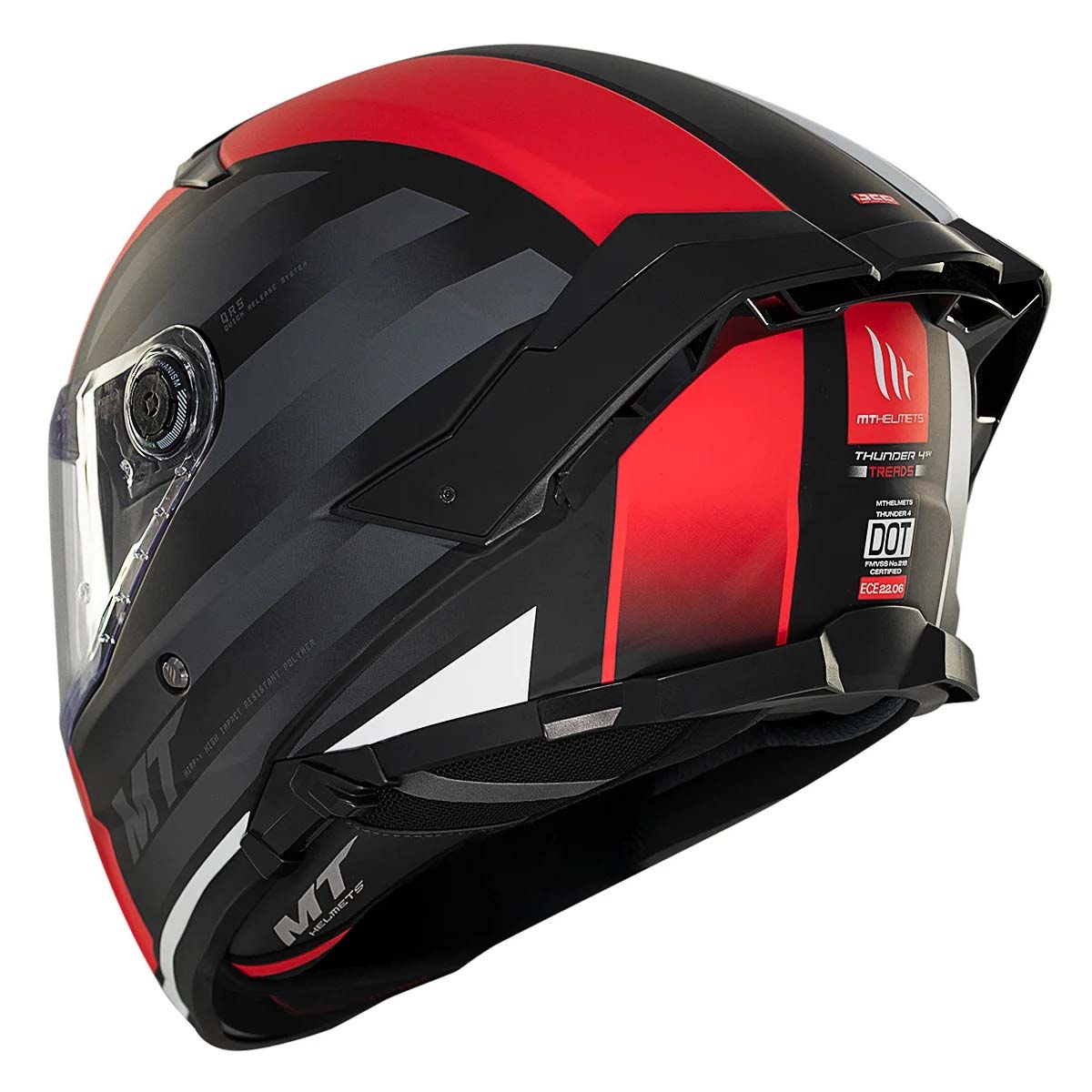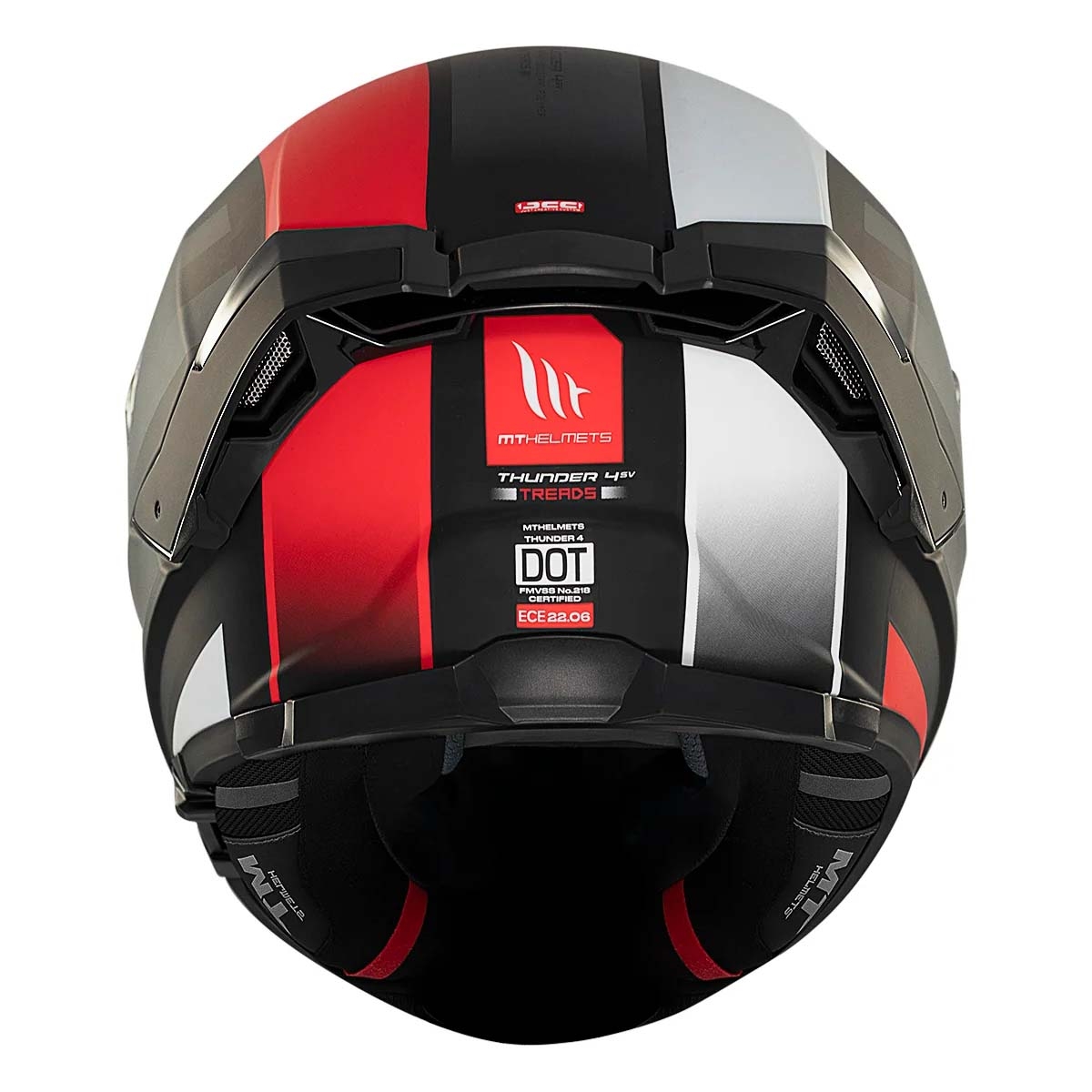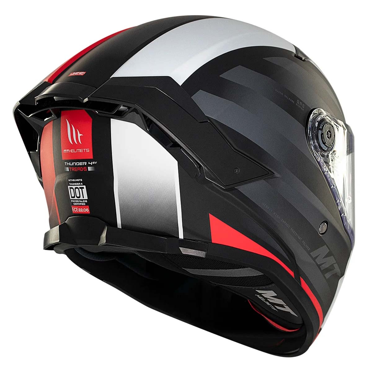 Casco MT Thunder 4 SV Treads B5 Mate. Thunder 4 SV FF118SV es el primer casco integral de MT Helmets en introducir la nueva homologación ECE 22.06. El casco está dotado de los últimos avances tecnológicos que son el resultado de la experiencia adquirida en las competiciones más prestigiosas. Está realizado en HIRP, una fórmula mejorada de polímeros inyectados en bloques muy precisos que proporciona mayor resistencia contra los impactos con un peso reducido.
