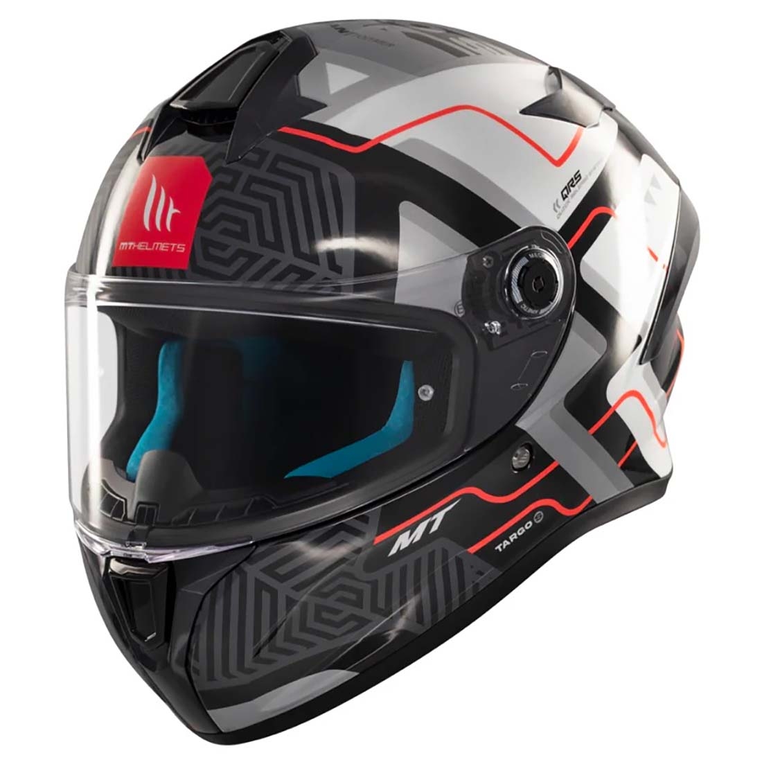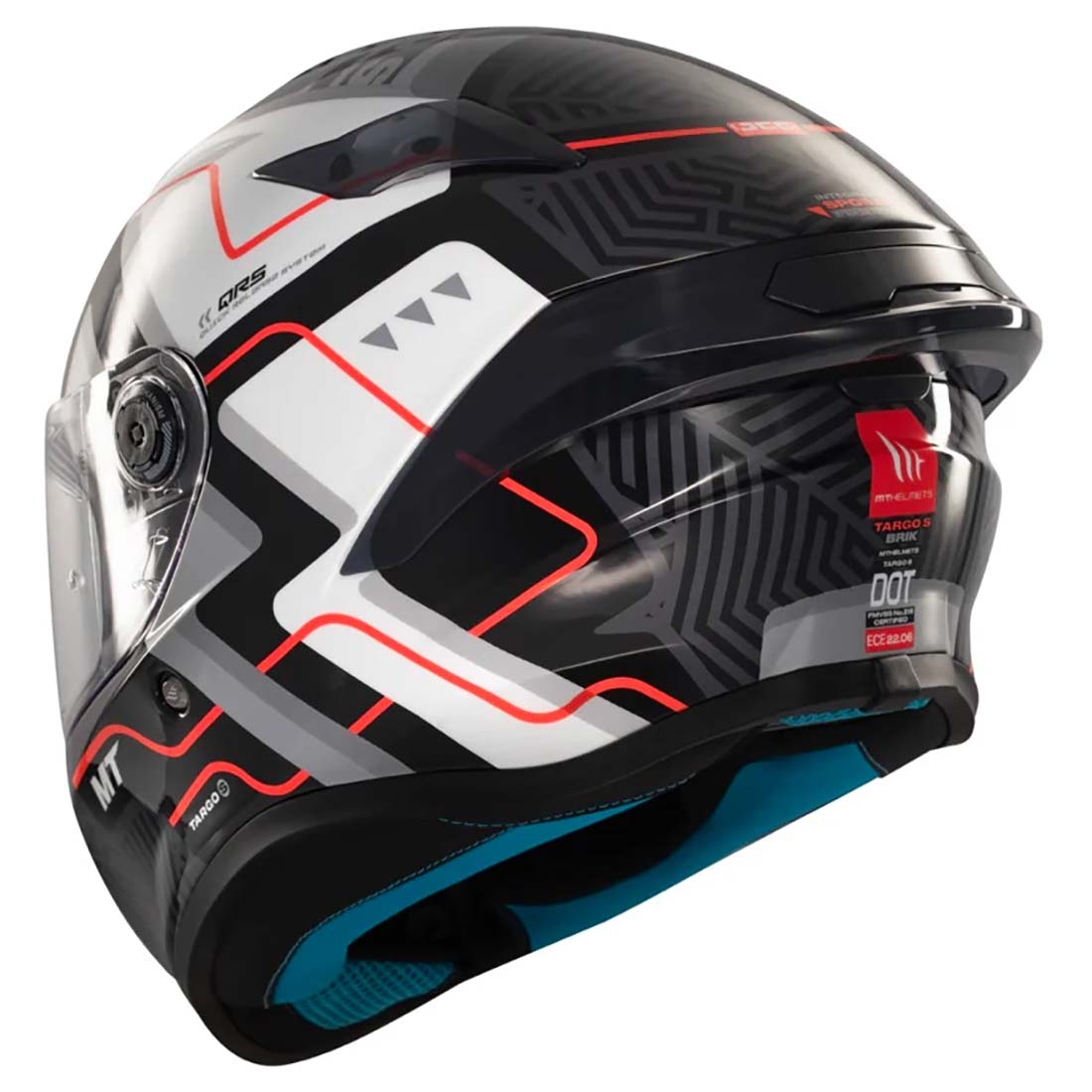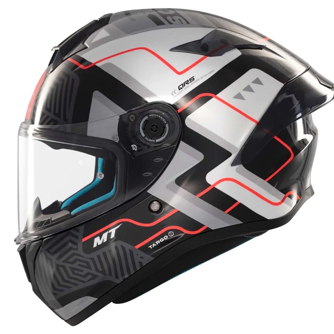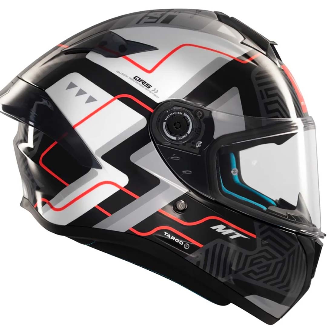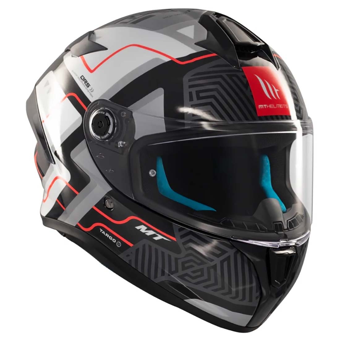 - Sistema MT-QVSS: El MT Helmets Targo S integra el exclusivo MT-QVSS (Quick Visor Swap System), un sistema de pantalla de alta resistencia con cambio rápido diseñado por el departamento de I+D+i de MT Helmets. Este sistema facilita el cambio de la pantalla, adaptándose rápidamente a las condiciones de iluminación y clima.