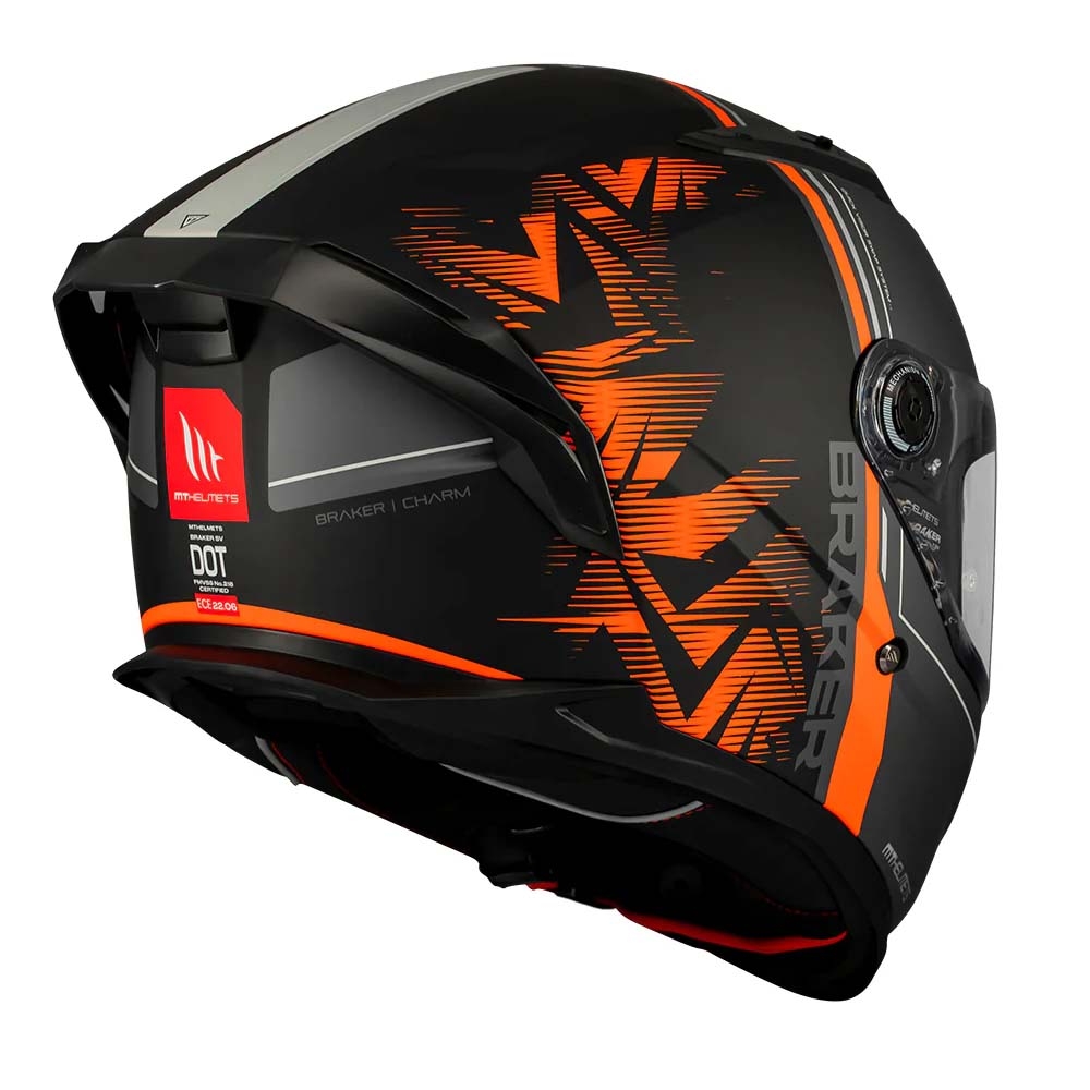 - Pantalla y Visor Solar: El MT Braker SV incorpora la pantalla MTV-28B de alta resistencia con sistema MT-QVSS (Quick Visor Swap System) para un cambio rápido y seguro de la visera. Además, incluye un visor solar de accionamiento monomando directo, ofreciendo protección contra el sol y reduciendo la fatiga ocular.