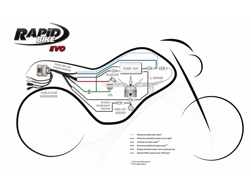 Rapid Bike Evo soporta el cambio electrónico (si se cuenta con la conexión al sensor opcional), la gestión múltiple de mapas con el interruptor opcional de los mapas en las motos que lo permiten (véase la lista de aplicaciones detallada), el aumento de las revoluciones del motor (hasta + 1000 rpm) y la eliminación del limitador de velocidad. En los motores bicilíndricos provistos de dos sondas lambda se puede programar un mapa y una estrategia de autocorrección específica para cada cilindro. Con la llegada del controlador en el manillar Youtune, la unidad de control Evo adquiere también la gestión del freno del motor (ya presente en la Racing) y el limitador de avance.