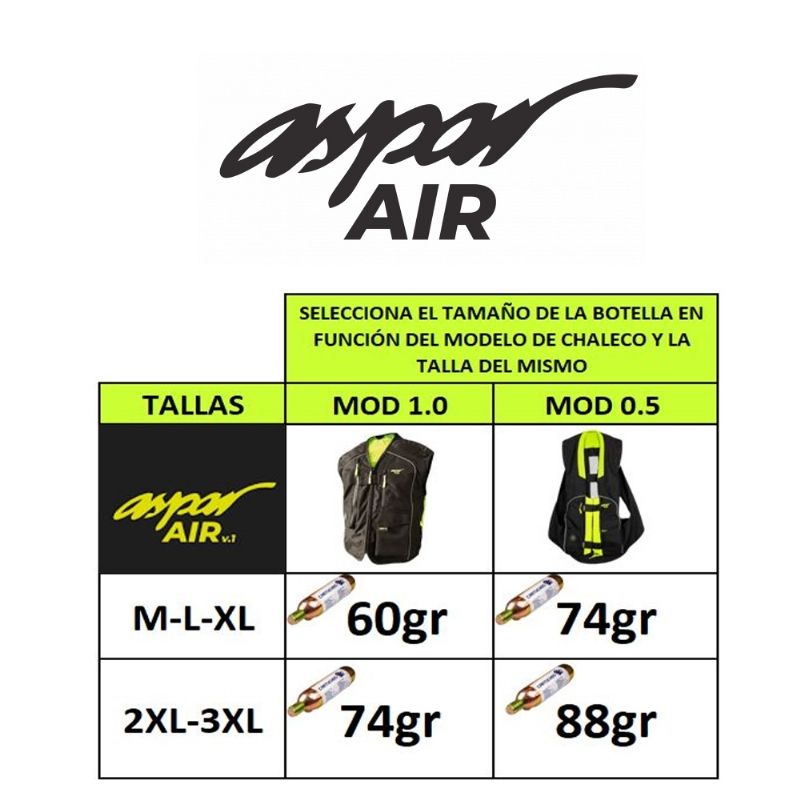 Guía de tallas y cartuchos de recarga para los chalecos Airbag Aspar Air: