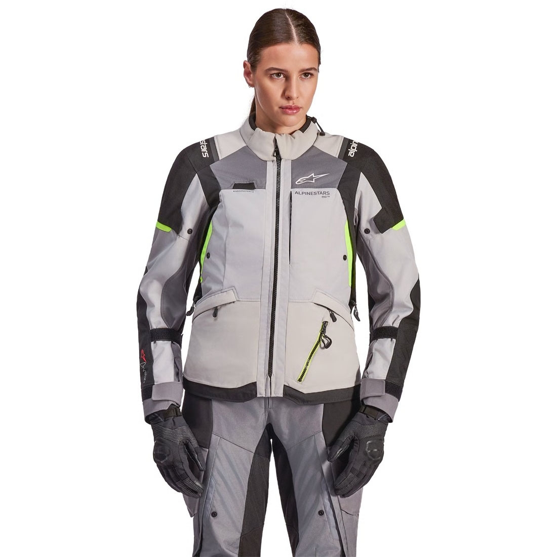 Chaqueta Alpinestars Stella Andes V4 Drystar Lady Hielo / Gris Oscuro / Negro / Amarillo Fluor. La Chaqueta Alpinestars Stella Andes V4 Drystar® Lady 2026 redefine la protección y el confort para las motoristas que buscan un equipamiento touring completo y versátil. Diseñada con un corte anatómico femenino y la exclusiva tecnología Drystar® 100% impermeable y transpirable, garantiza confort, rendimiento y protección en todo tipo de condiciones climáticas.