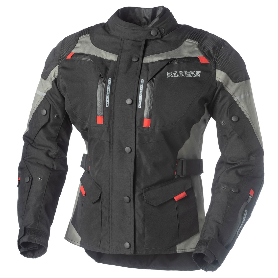 Chaqueta Rainers Duna Lady Negro. Nueva chaqueta de turismo Rainers Duna Lady de colores discretos y diseño elegante. La Duna Lady es la chaqueta perfecta para recorrer largas distancias donde las condiciones de clima puede cambiar en cualquier momento. Dispone de una práctica membrana impermeable que se puede desmontar en unos segundos igual que el forro térmico, ofreciendo una chaqueta más ligera en caso de la temperatura suba. Confeccionada principalmente en poliéster duradero, la Duna incorpora ventilación en la zona delantera y trasera y diferentes regulaciones para garantizar un ajuste personalizado. Cuenta con protectores homologados (CE) en codos y hombros, detalles reflectantes en puntos clave y varios bolsillos interiores y exteriores.
