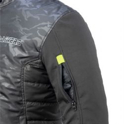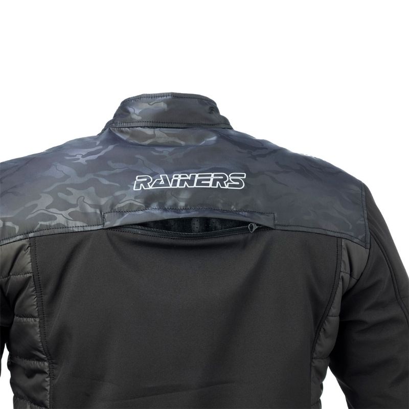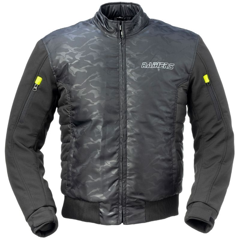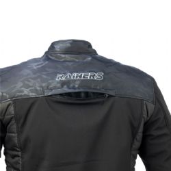 Chaqueta Rainers Urban Negro. La chaqueta Rainers Urban se presenta como una fusión ejemplar de estilo contemporáneo y funcionalidad robusta, diseñada meticulosamente para el motociclista moderno que navega por el entorno urbano. Parte de la colección 2024, este modelo de invierno touring se distingue por su tejido iridiscente en las zonas frontal y trasera, adornado con un estampado de camuflaje sutil que proyecta una estética moderna sin ser abrumador.