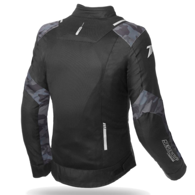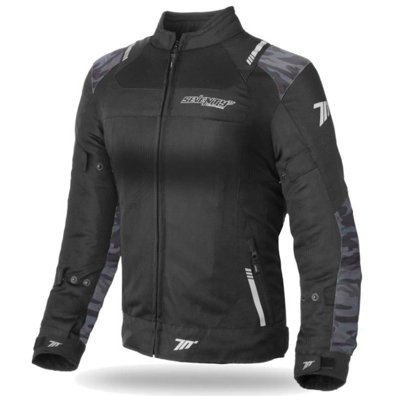 Chaqueta Seventy Degrees SD-JR54 Woman Verano Racing Negra / Camuflaje. Nueva chaqueta de verano Seventy Degrees SD-JR54 Woman (colección 2021) que destaca por su corte ajustado y diseño corto deportivo. Confeccionada en poliéster 600D con amplios paneles de tejido perforado tanto en la parte delantera como en la trasera para una excelente ventilación en días cálidos. La chaqueta Seventy Degrees SD-JR54 Woman incorpora regulaciones en los brazos y en la cintura que permiten un ajuste ceñido y personalizado al cuerpo. Las protecciones en codos, hombres y espalda ofrecen mayor seguridad en caso de caída, mientras que los reflectantes, posicionados estratégicamente, le confieren una visibilidad superior por la noche.