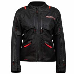 Chaqueta Seventy SD-JT69 Tanami Mujer Negro / Rojo. La Seventy SD-JT69 Tanami Woman es la chaqueta touring y adventure diseñada específicamente para mujeres que buscan comodidad, seguridad y estilo en cada ruta. Fabricada en Ripstop de alta tenacidad con paneles elásticos en las axilas, ofrece una excelente resistencia a la abrasión y total libertad de movimiento.