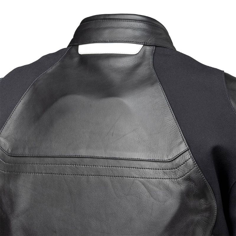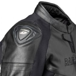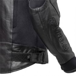 Chaqueta de piel Rainers Metropolis Negro. Esta imponente chaqueta combina la elegancia de la piel flor con la versatilidad del nylon elástico en áreas clave, garantizándote un máximo confort y libertad de movimiento en tus rutas moteras. En su diseño exterior, cuenta con dos prácticos bolsillos, ajustes mediante velcro en la zona pelviana, elementos reflectantes y ventilaciones estratégicamente ubicadas tanto en la espalda como en los laterales. Los protectores en los hombros no solo brindan una seguridad superior, sino que también le confieren un diseño inconfundiblemente motero.