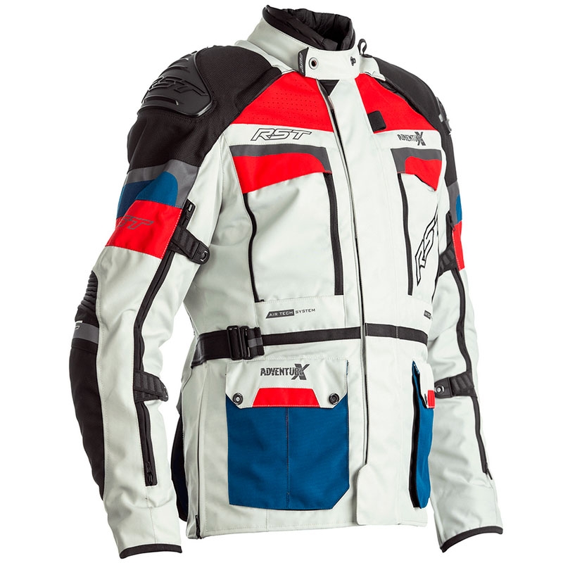 Chaqueta textil RST Pro Series Adventure-X CE Azul / Rojo. Desde el gélido invierno escocés hasta el abrasador desierto australiano, la Adventure-X es la chaqueta ideal para el motociclismo de aventura. Confeccionada con tejido de alta calidad (MaxTex) para ofrecer altos niveles de confort, protección y resistencia a la abrasión. Altamente versátil en diferentes tipos de clima gracias a la incorporación del innovador X-Liner, un forro muy ligero que presenta la combinación del forro térmico acolchado y la membrana impermeable SinAqua. Además se puede quitar fácilmente y guardar en el bolsillo portamapas ubicado en la zona trasera de la chaqueta. Las múltiples ventilaciones en el pecho, los brazos y la parte trasera, aseguran excelentes niveles de flujo de aire dentro y fuera de la chaqueta, manteniéndote fresco mientras conduces.