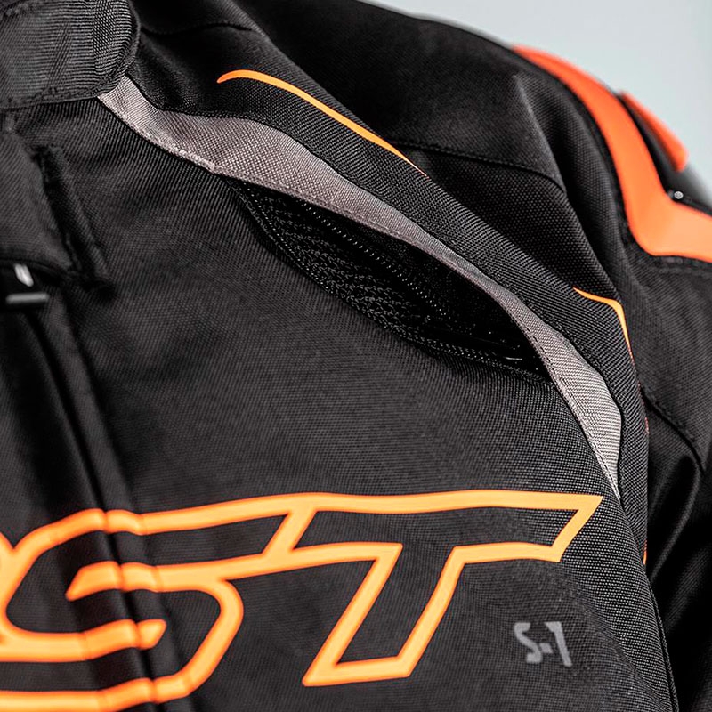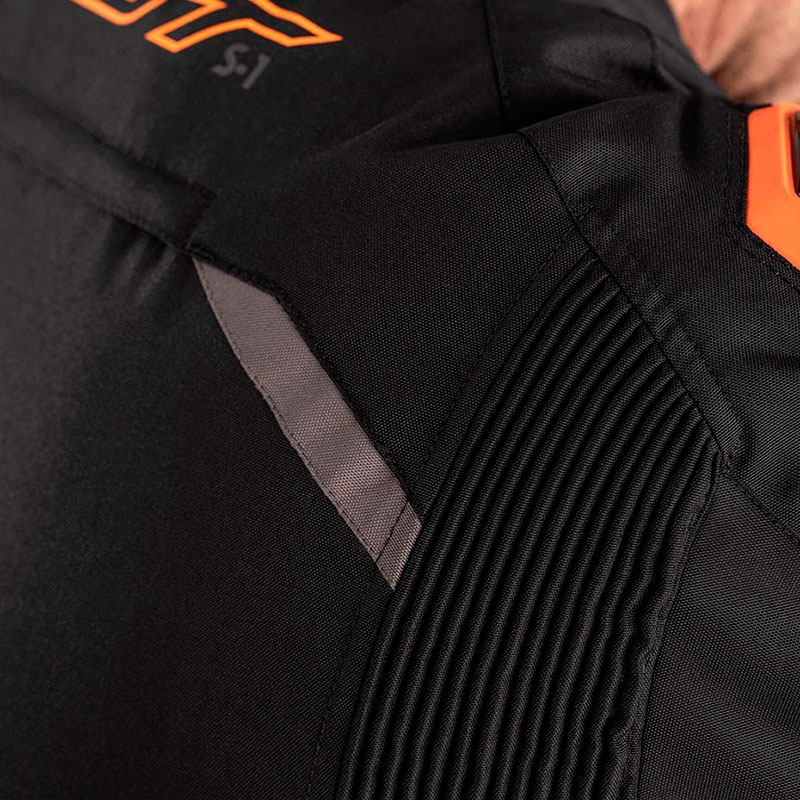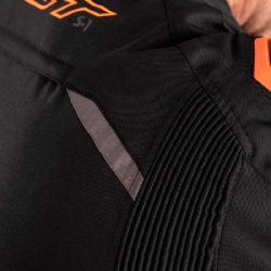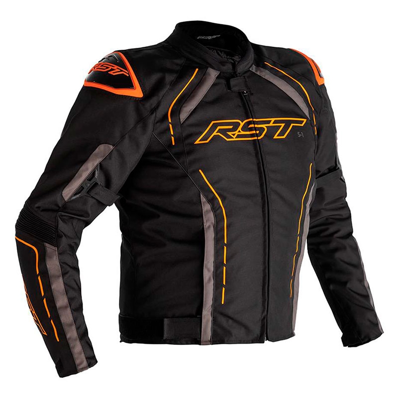 Chaqueta textil RST S1 Negro / Gris / Naranja. De aspecto deportivo a la vez que agresivo, la chaqueta RST S1 ha sido diseñada para ofrecer confort, seguridad y versatilidad en el día a día. Confeccionada con tejido muy resistente Maxtex, dispone de forro impermeable SinAqua, forro térmico extraíble y sistema de ventilación para una protección total contra los elementos. Incorpora paneles elásticos detrás de codos y brazos para mayor movilidad y diferentes ajustes en puños, mangas y cintura para un ajuste personalizado. La chaqueta RST S1 está equipada con protectores interiores CE Nivel 1 en codos y hombros pero además dispone de otros protectores exteriores de PU moldeado para una resistencia adicional a los impactos.
